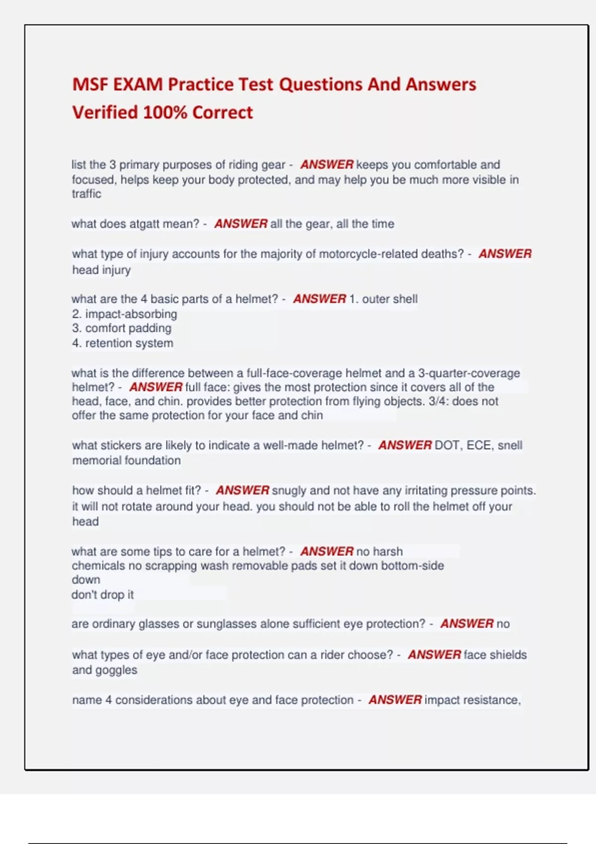 MSF EXAM Practice Test Questions And Answers Verified 100% Correct list the 3 primary purposes of riding gear - ANSWER keeps you comfortable and focused, helps keep your body protected, and may help you be much more visible in traffic what does atgatt mean? - ANSWER all the gear, all the time what type of injury accounts for the majority of motorcycle-related deaths? - ANSWER head injury what are the 4 basic parts of a helmet? - ANSWER 1. outer shell 2. impact-absorbing 3. comfort padding 4. retention system what is the difference between a full-face-coverage helmet and a 3-quarter-coverage helmet? - ANSWER full face: gives the most protection since it covers all of the head, face, and chin. provides better protection from flying objects. 3/4: does not offer the same protection for your face and chin what stickers are likely to indicate a well-made helmet? - ANSWER DOT, ECE, snell memorial foundation how should a helmet fit? - ANSWER snugly and not have any irritating pressure points. it will not rotate around your head. you should not be able to roll the helmet off your head what are some tips to care for a helmet? - ANSWER no harsh chemicals no scrapping wash removable pads set it down bottom-side down don't drop it are ordinary glasses or sunglasses alone sufficient eye protection? - ANSWER no what types of eye and/or face protection can a rider choose? - ANSWER face shields and goggles name 4 considerations about eye and face protection - ANSWER impact resistance, free of scratches, clean, and clear to see what is the value of appropriate footwear? - ANSWER protect you from many riding hazards, give you grip on pavement, protect you from foot and ankle injuries what features of a full-fingered glove help a rider? - ANSWER protect from the wind, sun, heat, and cold. improve your grip and protect your hands in a fall. protect from flying debris. what is the value of motorcycle-specific clothing? - ANSWER prevent injury, durable, how can motorcycle riding gear make you more visible? - ANSWER wear bright colors during the day and reflective clothing at night what are some features your gear should have if you are riding in rain or cold weather? - ANSWER bright colors, high collar, zip up, large enough to fit over regular riding gear define hypothermia - ANSWER a lower than normal body temperature and causes loss of concentration and slower reaction what is wind chill? - ANSWER The temp of wind speed and air temp combined what is the value of dressing in layers? - ANSWER so you can adjust to weather conditions what should you be cautious of in hot weather? - ANSWER dehydration and heat exhaustion in what way can riding a motorcycle affect hearing and what can be done? - ANSWER wind noise and engine noise that can cause hearing damage. earplugs reduce damaging wind noise what does it mean to have a good mental attitude? - ANSWER safety is your number one priority. you are aware of the ricks in traffic and ask yourself such things as: am i ready to ride? am i tired or stressed out? am i confident my riding skills are sharp? am i able to focus on safety? where do most crashes occur? - ANSWER curves and at intersections name 3 reasons why riding a motorcycle involves more risk than driving a car or truck? - ANSWER 1. vehicle is less stable 2. you are more vulnerable 3. you are less visible what is the primary cause of motorcycle-related crashes? - ANSWER speeding what questions help you think about the risks of riding? - ANSWER 1. how good am i as a car driver 2. do i have many near-crashes when i drive 3. do i have to brake hard very often when i drive 4. am i easily distracted when i drive 5. do i have points on my license after learning to ride, why is safety more about mental skills than physical skills? - ANSWER you want a high level of perceptual and physical skills list the 3 key safety margins - ANSWER 1. having riding skill and motorcycle maneuverability beyond what is actually needed 2. having traction beyond what is actually needed 3. having time and space beyond what is actually needed what are 5 characteristics of a rider who manages risk properly? - ANSWER knowledge, skills, attitude, values, and habits what does it mean to have good risk offset? - ANSWER difference between the risks you take and the skill you possess what does it mean to have a good lane choice? - ANSWER pick a lane where you do not have to change lanes often and can see ahead while being visible to others what is the purpose of using 3 different positions within a lane? - ANSWER to avoid hazards, bad road conditions, and to see and be seen what is the start position? - ANSWER default position. to see and be seen name 3 smart ways to be more visible to others in traffic - ANSWER clothing, headlight, turn signals, brake light, horn, add-ons what are the 3 visual lead times of rider radar? - ANSWER 2-second following time and distance 4-second urgent time and distance 12-second anticipation time and distance why is the 2-second following distance considered minimum? - ANSWER when conditions are ideal and you are paying close attention ahead. it helps you avoid running into the vehicle in front of you if it slows suddenly