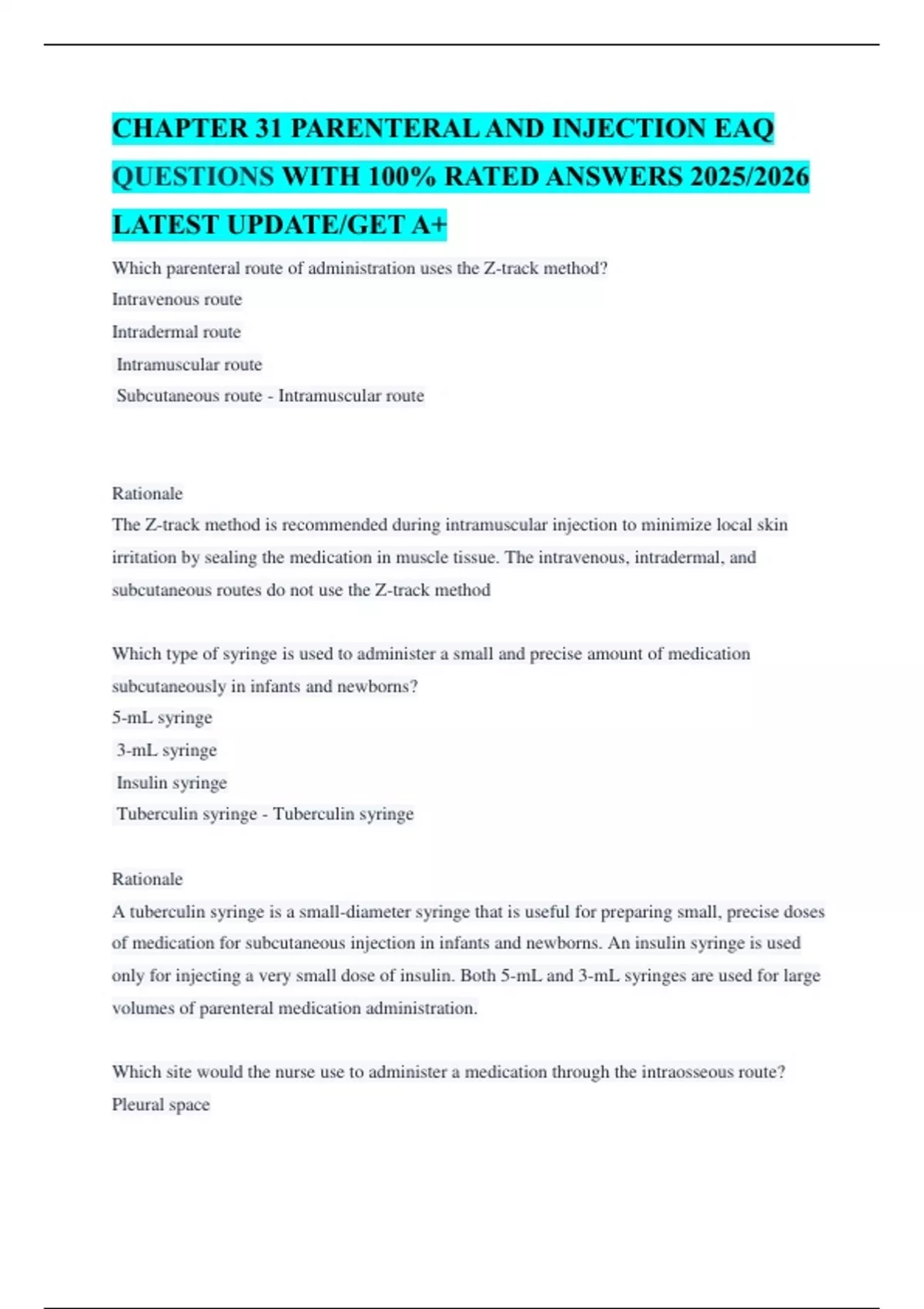 This resource includes EAQ-style questions for Chapter 31, focusing on parenteral medication administration. It highlights injection techniques (Z-track, intradermal, subcutaneous), drug preparation for different routes, insulin and heparin usage, pediatric injection considerations, and safety protocols. Ideal for clinical skills prep.