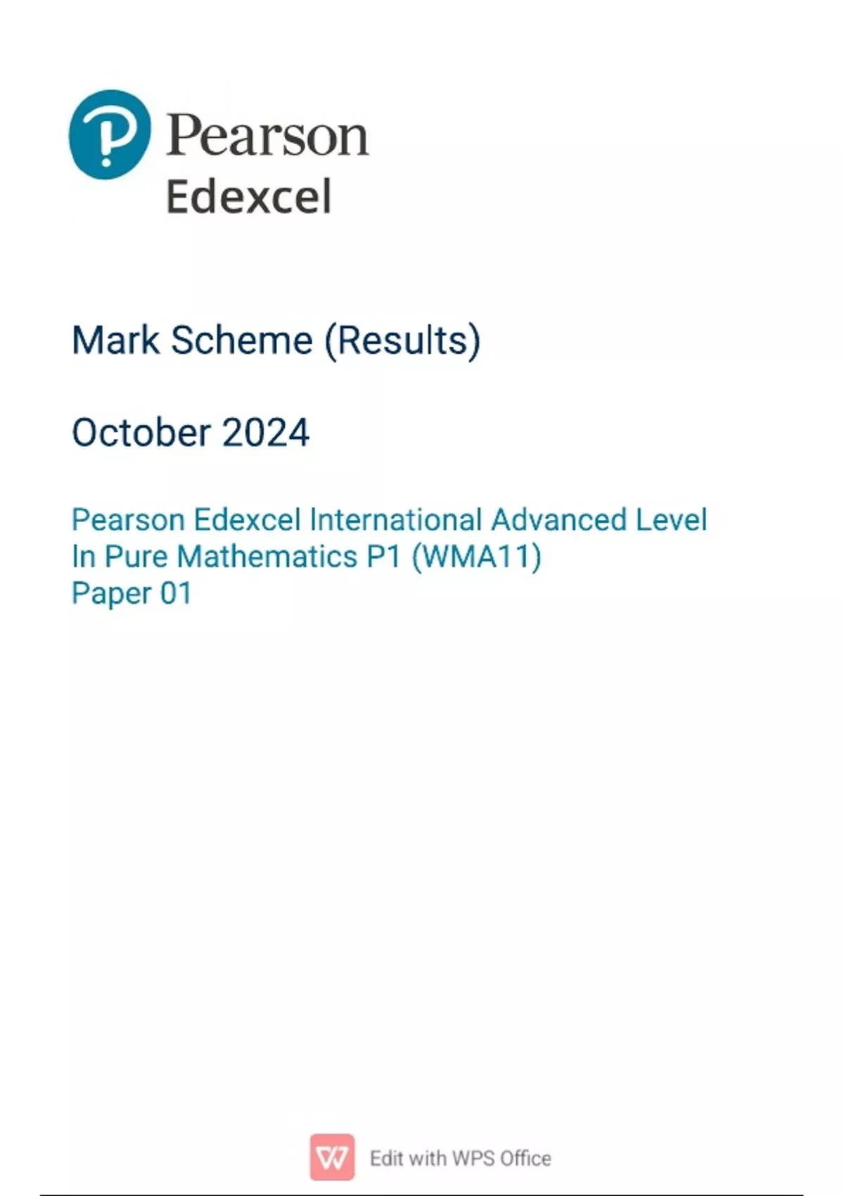 2024 Pearson Edexcel International Advanced Level In Pure Mathematics P1 (WMA11) Paper 01 Mark Scheme