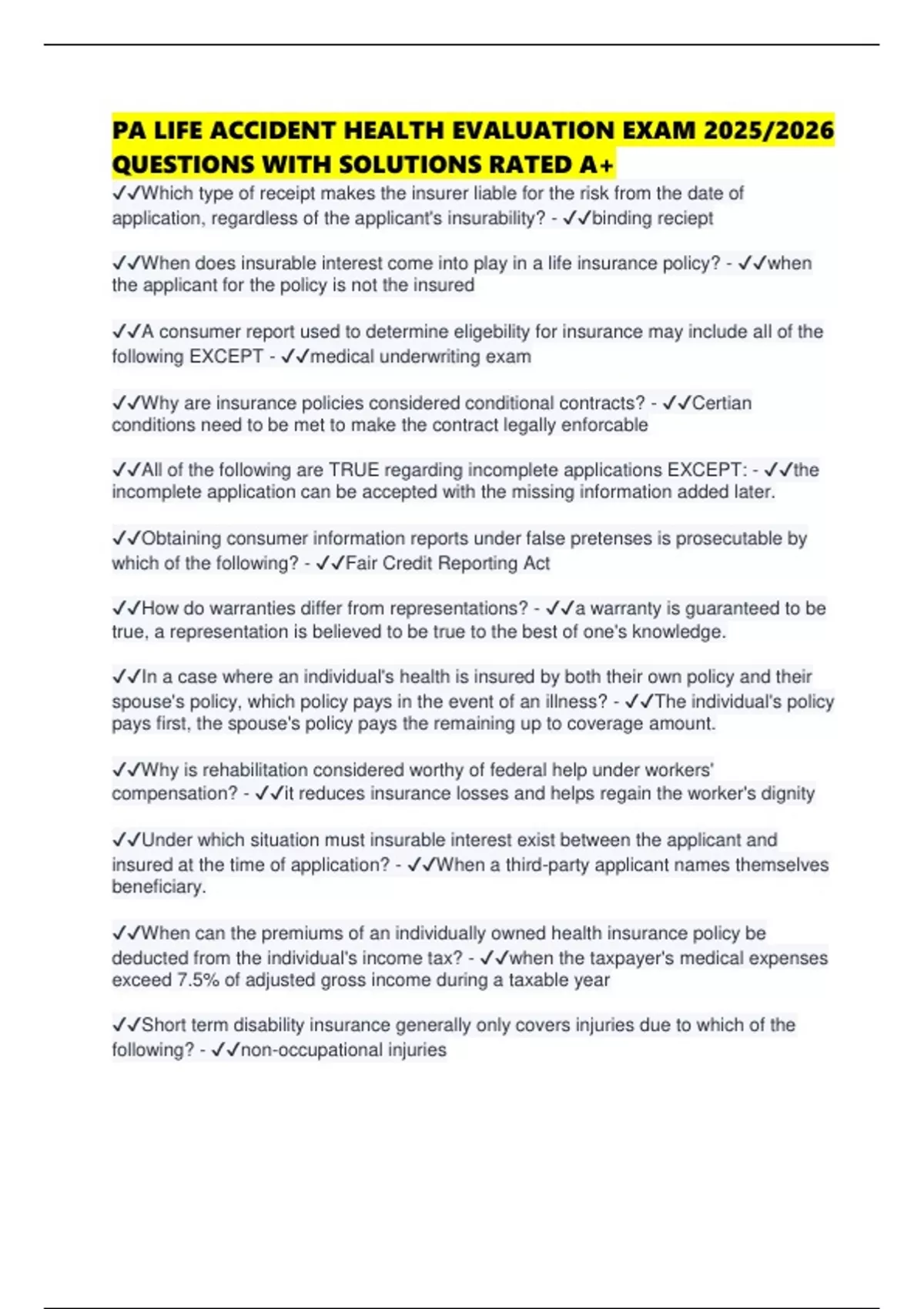 PA LIFE ACCIDENT HEALTH EVALUATION EXAM 2025/2026 QUESTIONS WITH SOLUTIONS RATED A+