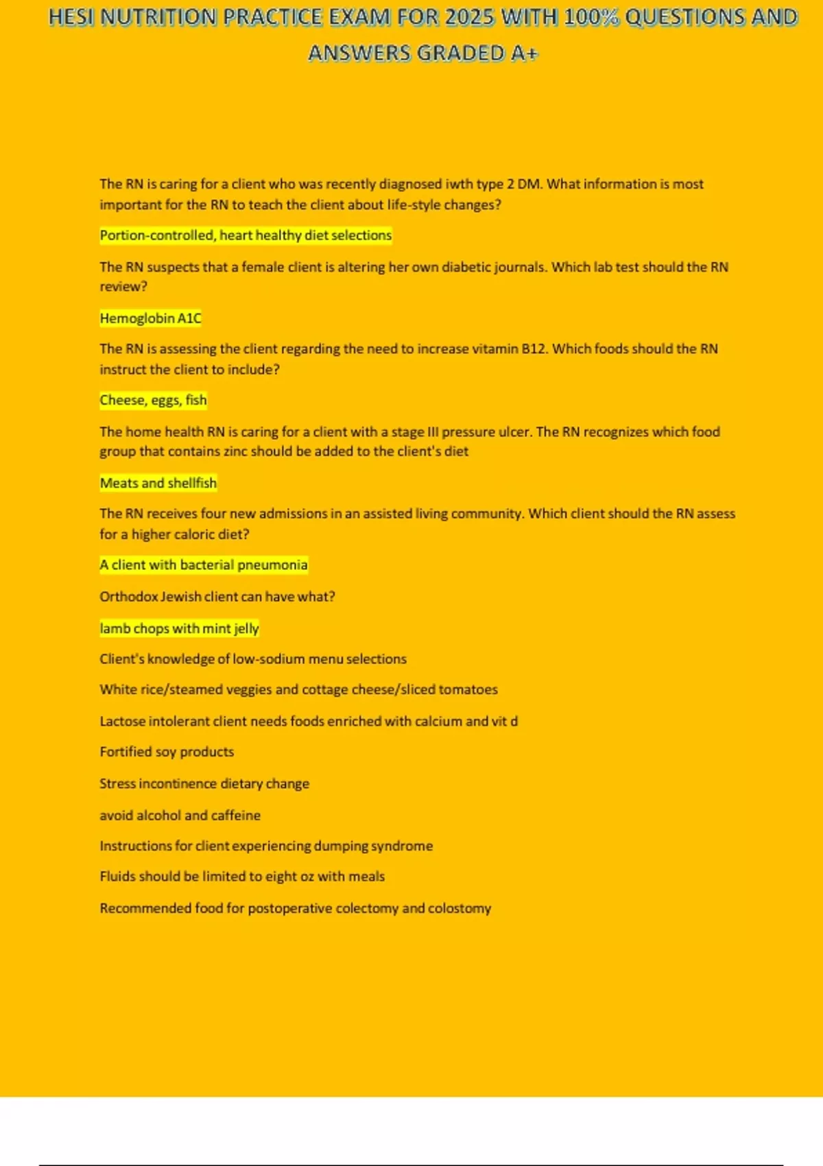 HESI NUTRITION PRACTICE EXAM FOR 2025 WITH 100% QUESTIONS AND ANSWERS GRADED A+