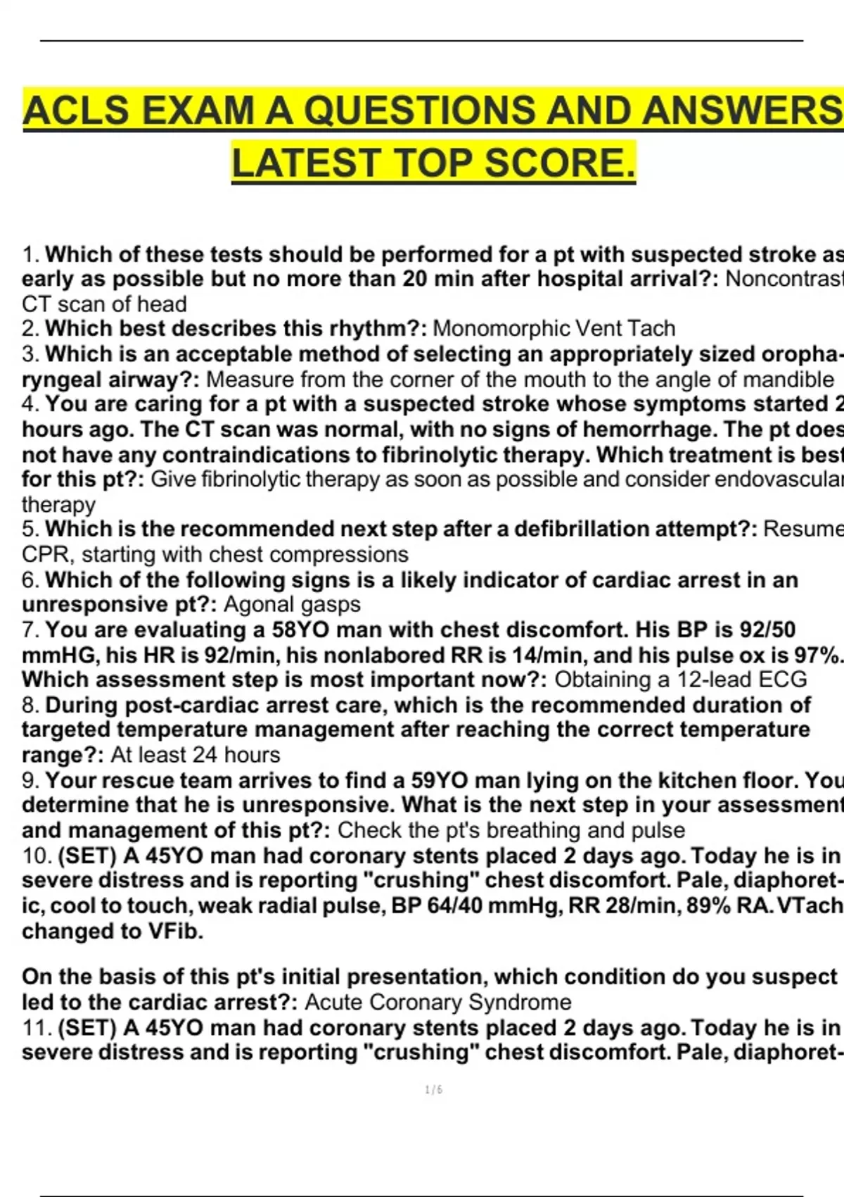 ACLS EXAM A QUESTIONS AND ANSWERS