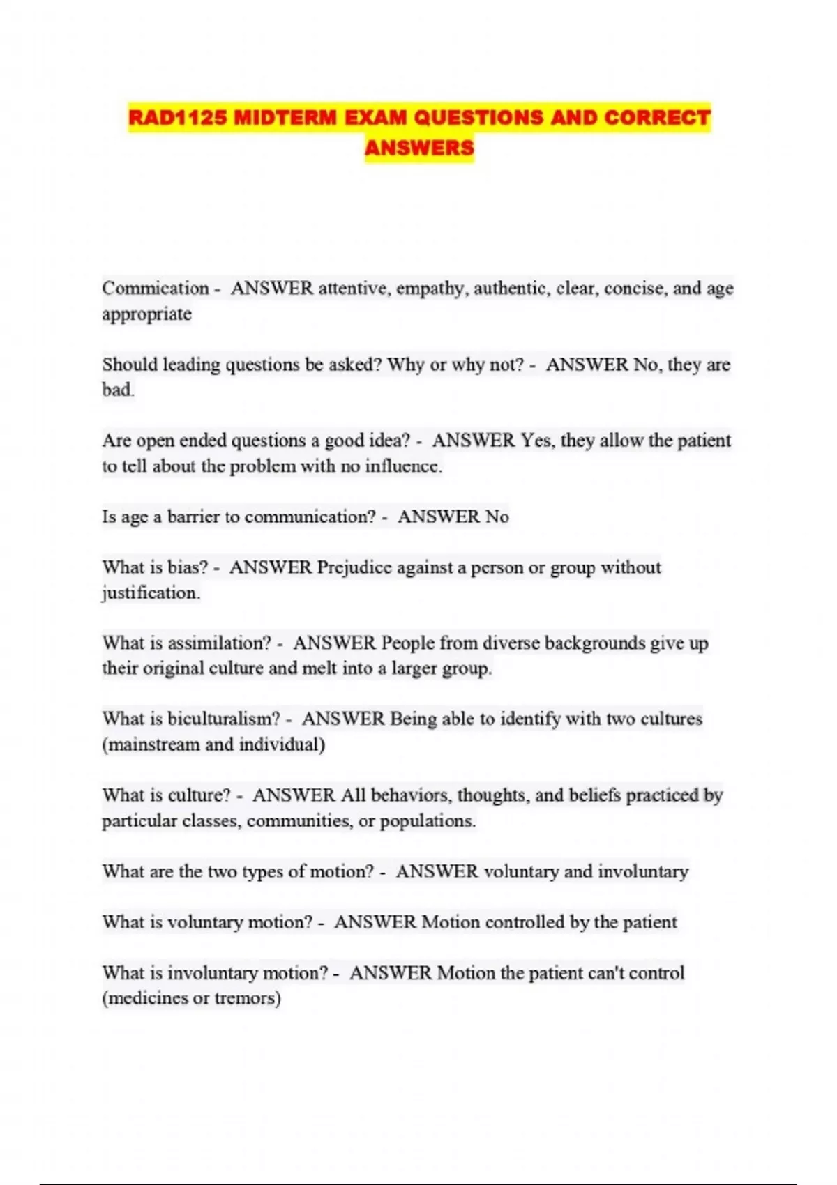RAD1125 MIDTERM EXAM QUESTIONS AND CORRECT ANSWERS