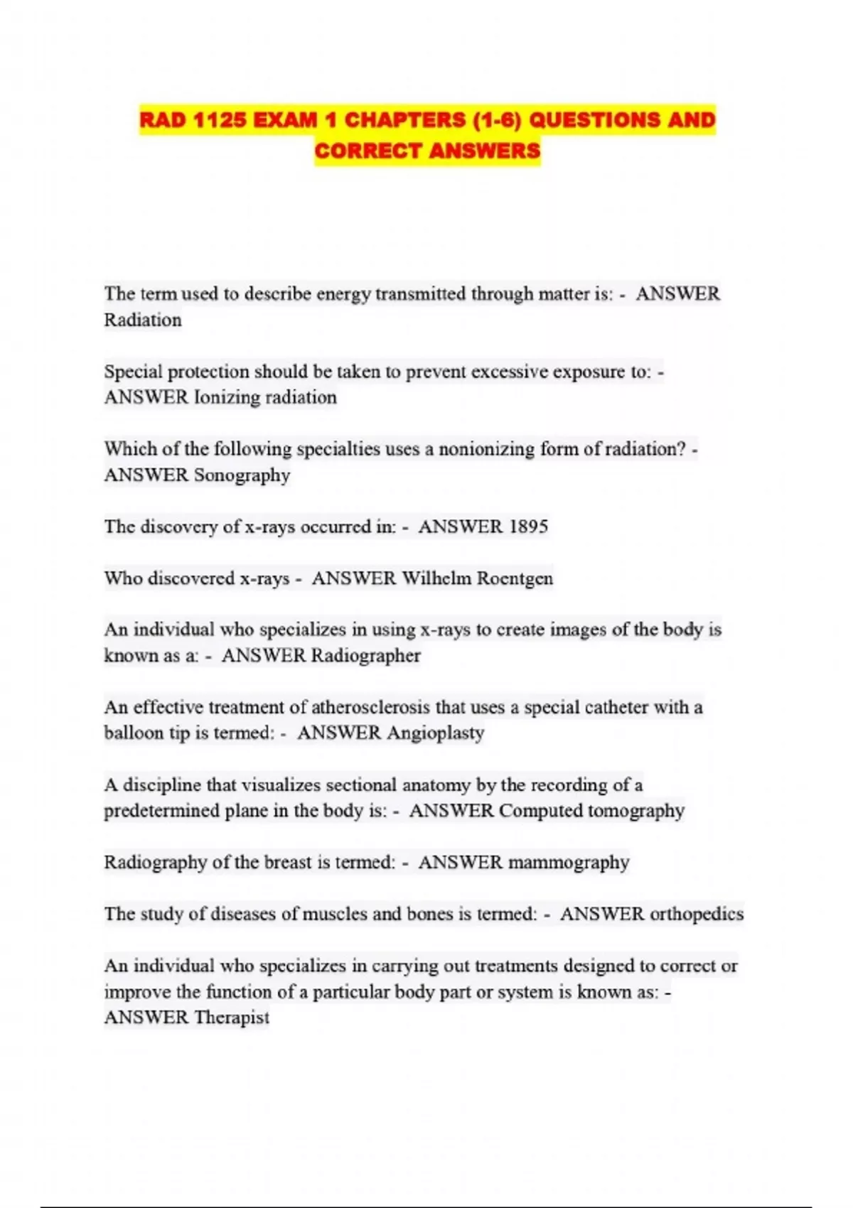 RAD 1125 EXAM 1 CHAPTERS (1-6) QUESTIONS AND CORRECT ANSWERS...