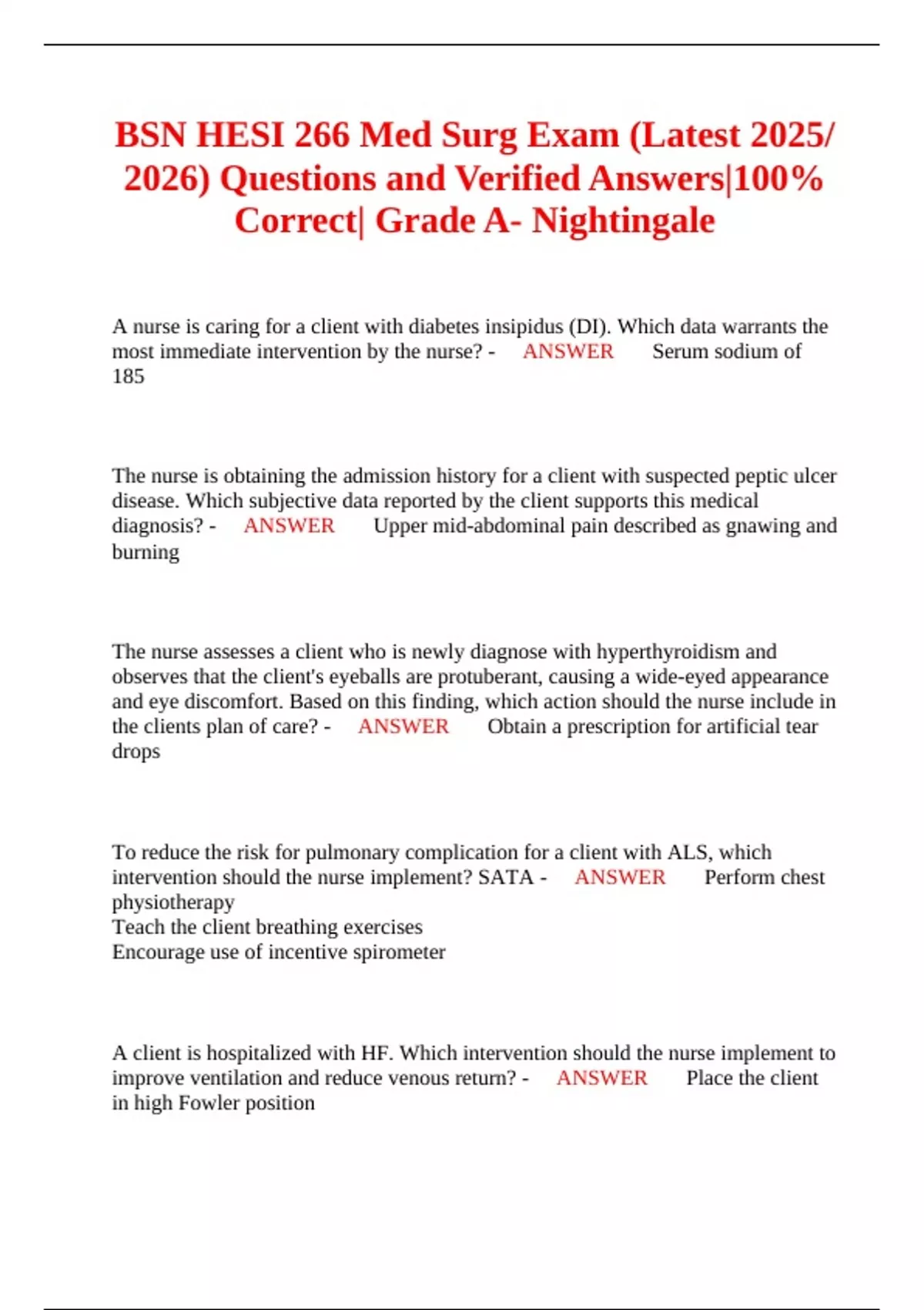 BSN HESI 266 Med Surg Exam (Latest 2025/ 2026) Questions and Verified Answers|100% Correct| Grade A- Nightingale
