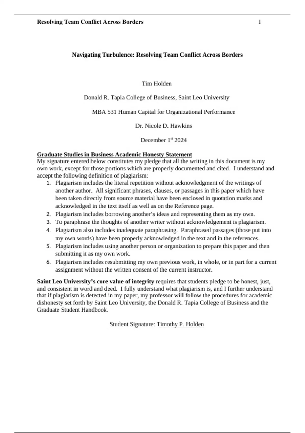 dishonesty set forth by Saint Leo University, the Donald R. Tapia College of Business and the
