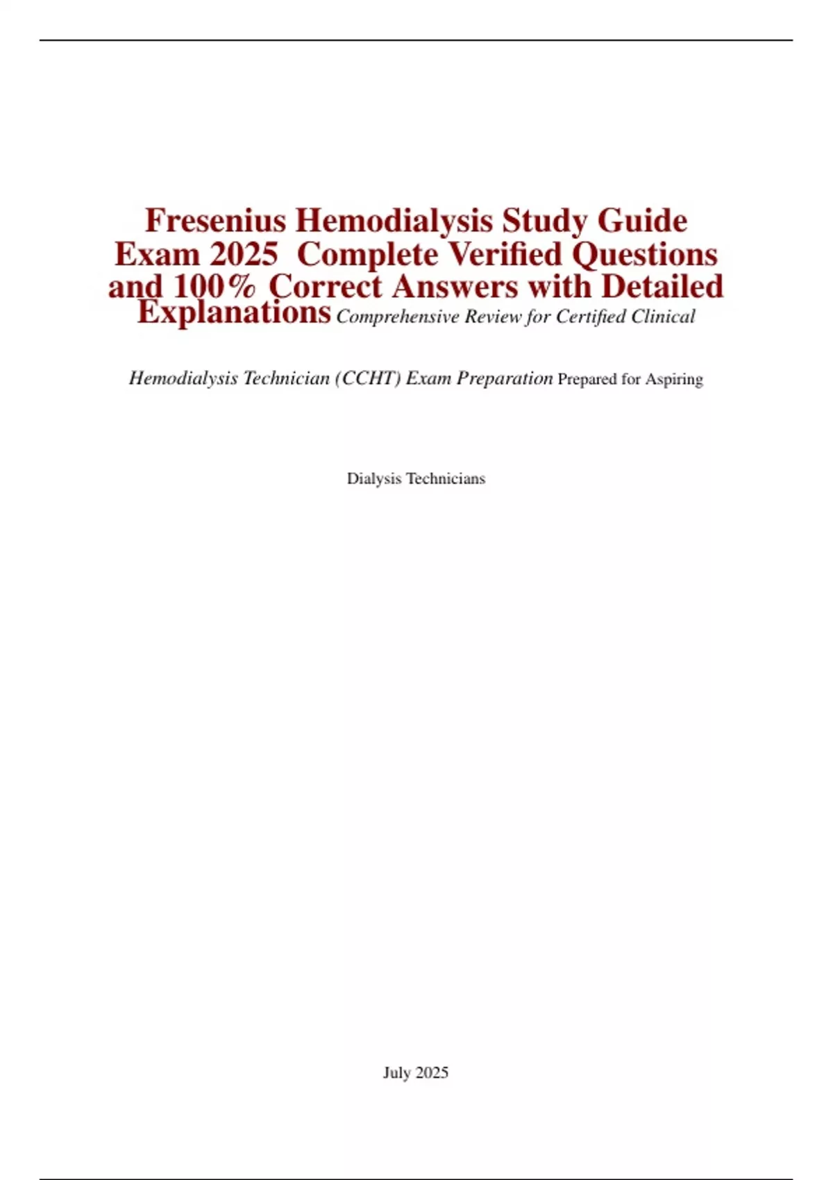 Fresenius Hemodialysis Study Guide Exam 2025 Complete Verified Questions and 100% Correct Answers with Detailed Explanations Comprehensive Review for Certified Clinical Hemodialysis Technician (CCHT) Exam Preparation Updated for 2025/2026 Certification Cycle Prepared for Dialysis Technicians and Nurses Introduction This study guide is tailored for the Fresenius Hemodialysis Exam and the Certified Clinical Hemodialysis Technician (CCHT) certification for the 2025/2026 cycle. It includes 100 carefully curated questions with accurate answers and detailed explanations, covering dialysis fundamentals, patient care, infection control, water treatment, and equipment management. The content is streamlined to eliminate unnecessary jargon, focusing on essential topics aligned with Fresenius clinical protocols and Nephrology Nursing Certification Commission (NNCC) guidelines. Questions are highlighted in a very dark royal blue for clarity, ensuring a comprehensive and focused preparation for dialysis technicians and nurses.
