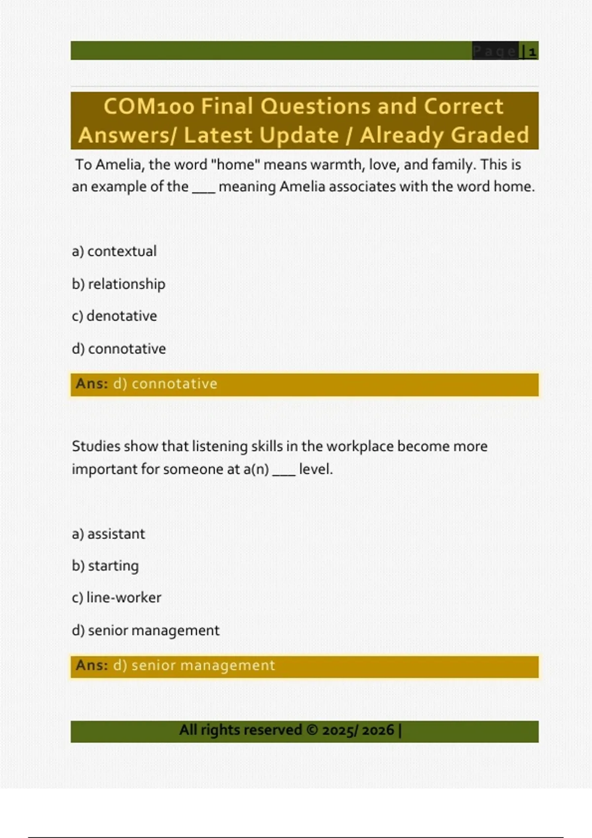 COM100 Final Questions and Correct Answers/ Latest Update / Already Graded