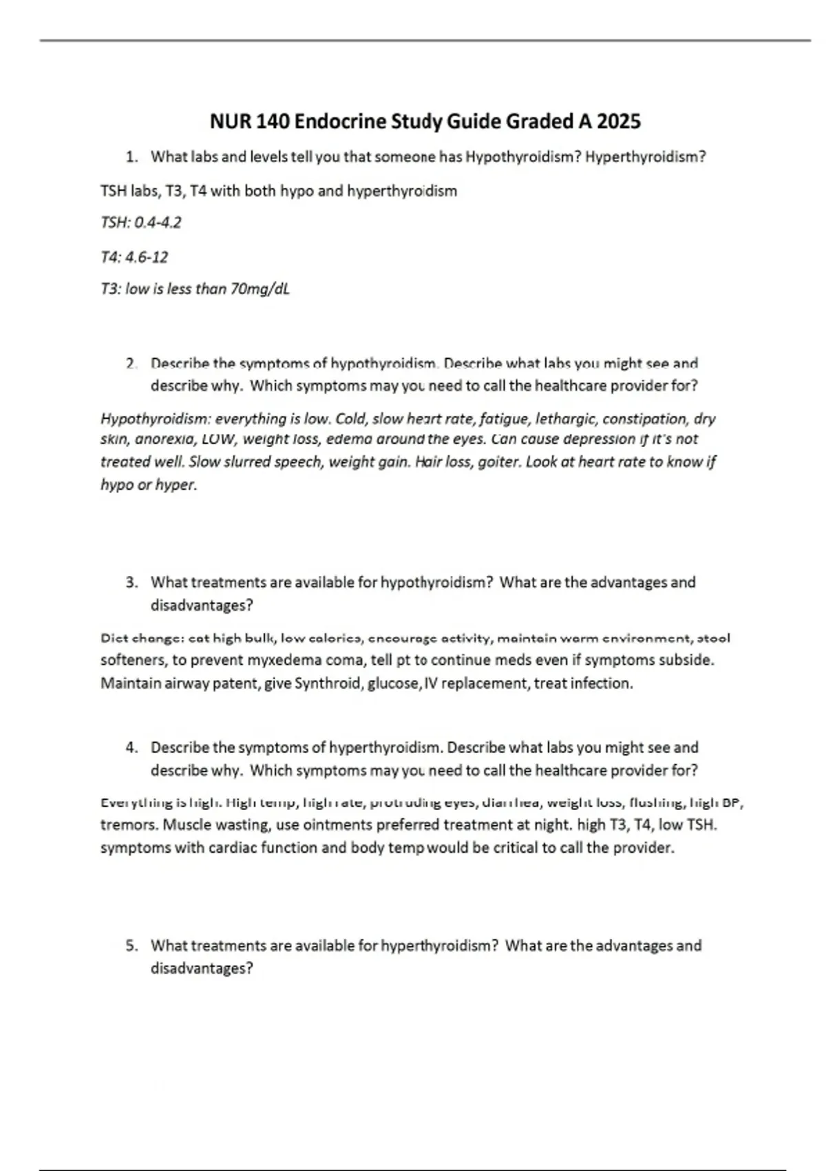 1. What labs and levels tell you that someone has Hypothyroidism? Hyperthyroidism? TSH labs, T3, T4 with both hypo and hyperthyroidism TSH: 0.4-4.2 T4: 4.6-12 T3: low is less than 70mg/dL 2. Describe the symptoms of hypothyroidism. Describe what labs you might see and describe why. Which symptoms may you need to call the healthcare provider for? Hypothyroidism: everything is low. Cold, slow heart rate, fatigue, lethargic, constipation, dry skin, anorexia, LOW, weight loss, edema around the eyes. Can cause depression if it's not treated well. Slow slurred speech, weight gain. Hair loss, goiter. Look at heart rate to know if hypo or hyper. 3. What treatments are available for hypothyroidism? What are the advantages and disadvantages? Diet change: eat high bulk, low calories, encourage activity, maintain warm environment, stool softeners, to prevent myxedema coma, tell pt to continue meds even if symptoms subside. Maintain airway patent, give Synthroid, glucose, IV replacement, treat infection. 4. Describe the symptoms of hyperthyroidism. Describe what labs you might see and describe why. Which symptoms may you need to call the healthcare provider for? Everything is high. High temp, high rate, protruding eyes, diarrhea, weight loss, flushing, high BP, tremors. Muscle wasting, use ointments preferred treatment at night. high T3, T4, low TSH. symptoms with cardiac function and body temp would be critical to call the provider. 5. What treatments are available for hyperthyroidism? What are the advantages and disadvantages?