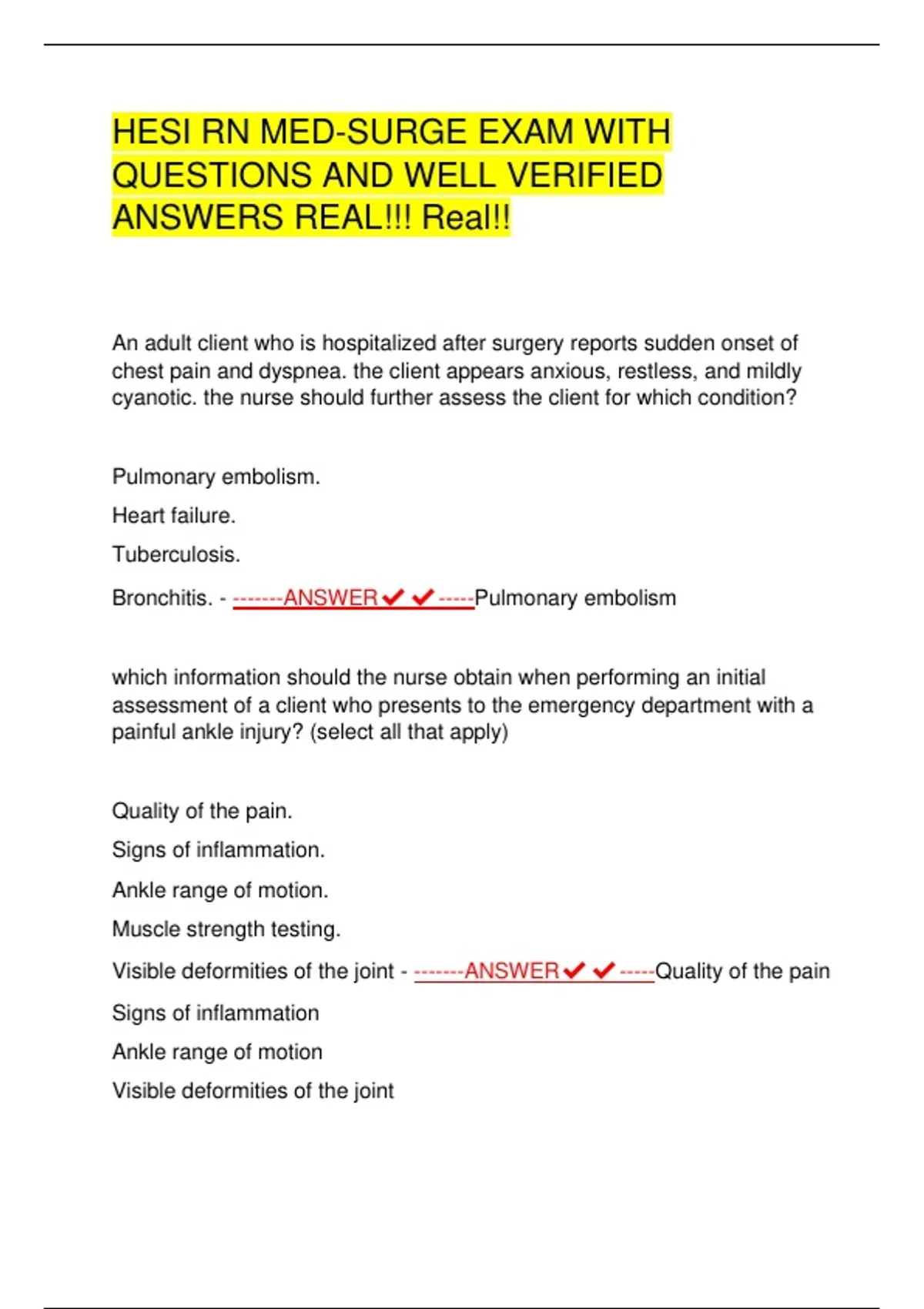 HESI RN MED-SURGE EXAM WITH QUESTIONS AND WELL VERIFIED ANSWERS REAL!!! Real!! An adult client who is hospitalized after surgery reports sudden onset of chest pain and dyspnea. the client appears anxious, restless, and mildly cyanotic. the nurse should further assess the client for which condition? Pulmonary embolism. Heart failure. Tuberculosis. Bronchitis. - -------ANSWER-----Pulmonary embolism which information should the nurse obtain when performing an initial assessment of a client who presents to the emergency department with a painful ankle injury? (select all that apply) Quality of the pain. Signs of inflammation. Ankle range of motion.