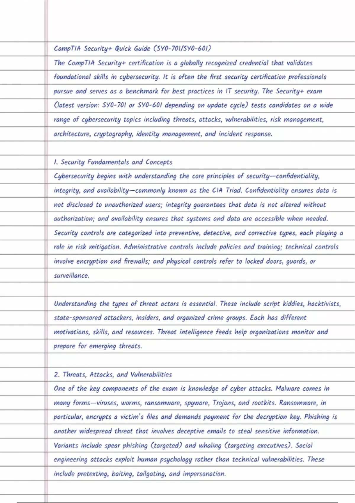 This PDF guide offers a concise and focused review of the core concepts covered in the CompTIA Security+ (SY0-601) certification exam. Designed for fast revision, it covers essential topics such as network security, threat management, cryptography, risk mitigation, identity and access management, and security operations. Ideal for students, IT professionals, or anyone preparing for the Security+ exam, this quick guide simplifies complex topics into digestible summaries, key terms, and bullet points to help you pass with confidence.
