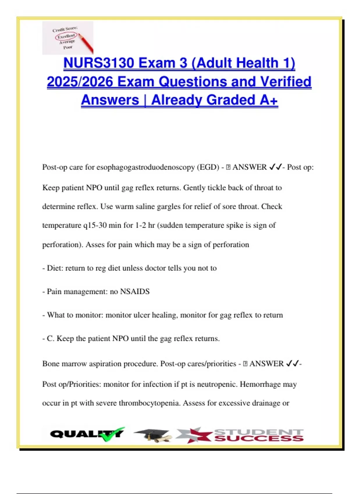 Post-op care for esophagogastroduodenoscopy (EGD) - 🧠 ANSWER ✔✔- Post op:
