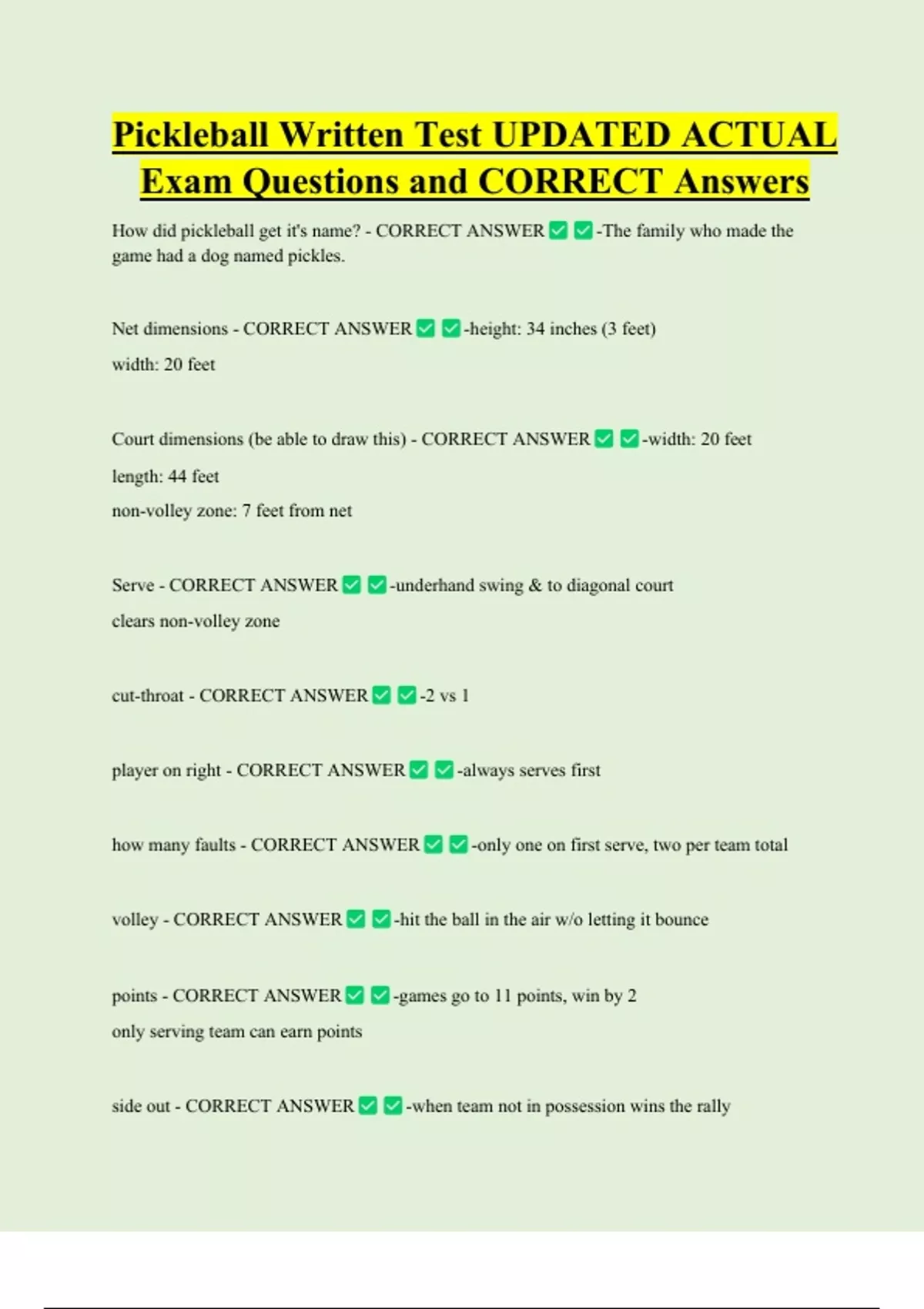 Pickleball Written Test UPDATED ACTUAL Exam Questions and CORRECT Answers