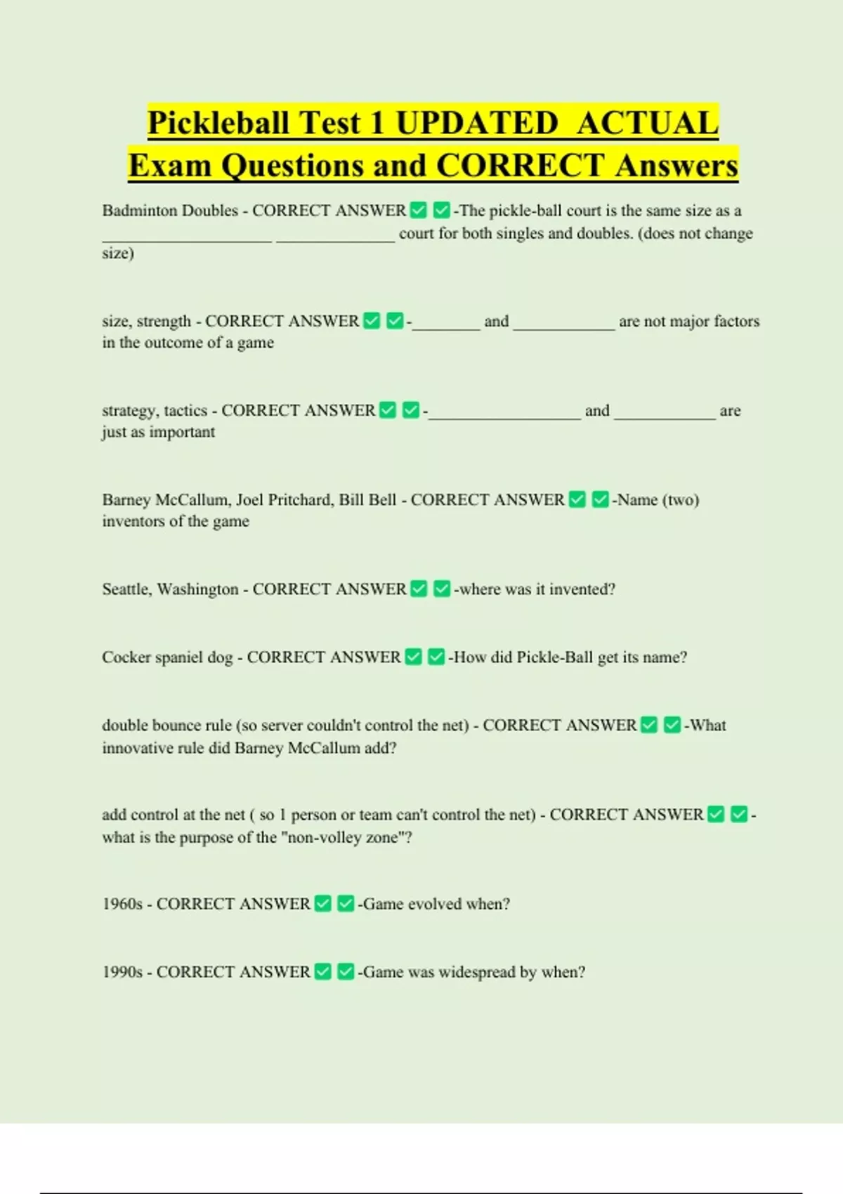Pickleball Test 1 UPDATED ACTUAL Exam Questions and CORRECT Answers Badminton Doubles - CORRECT ANSWER -The pickle-ball court is the same size as a ____________________ ______________ court for both singles and doubles. (does not change size) size, strength - CORRECT ANSWER in the outcome of a game strategy, tactics - CORRECT ANSWER just as important -________ and ____________ are not major factors -__________________ and ____________ are Barney McCallum, Joel Pritchard, Bill Bell - CORRECT ANSWER inventors of the game Seattle, Washington - CORRECT ANSWER -Name (tw