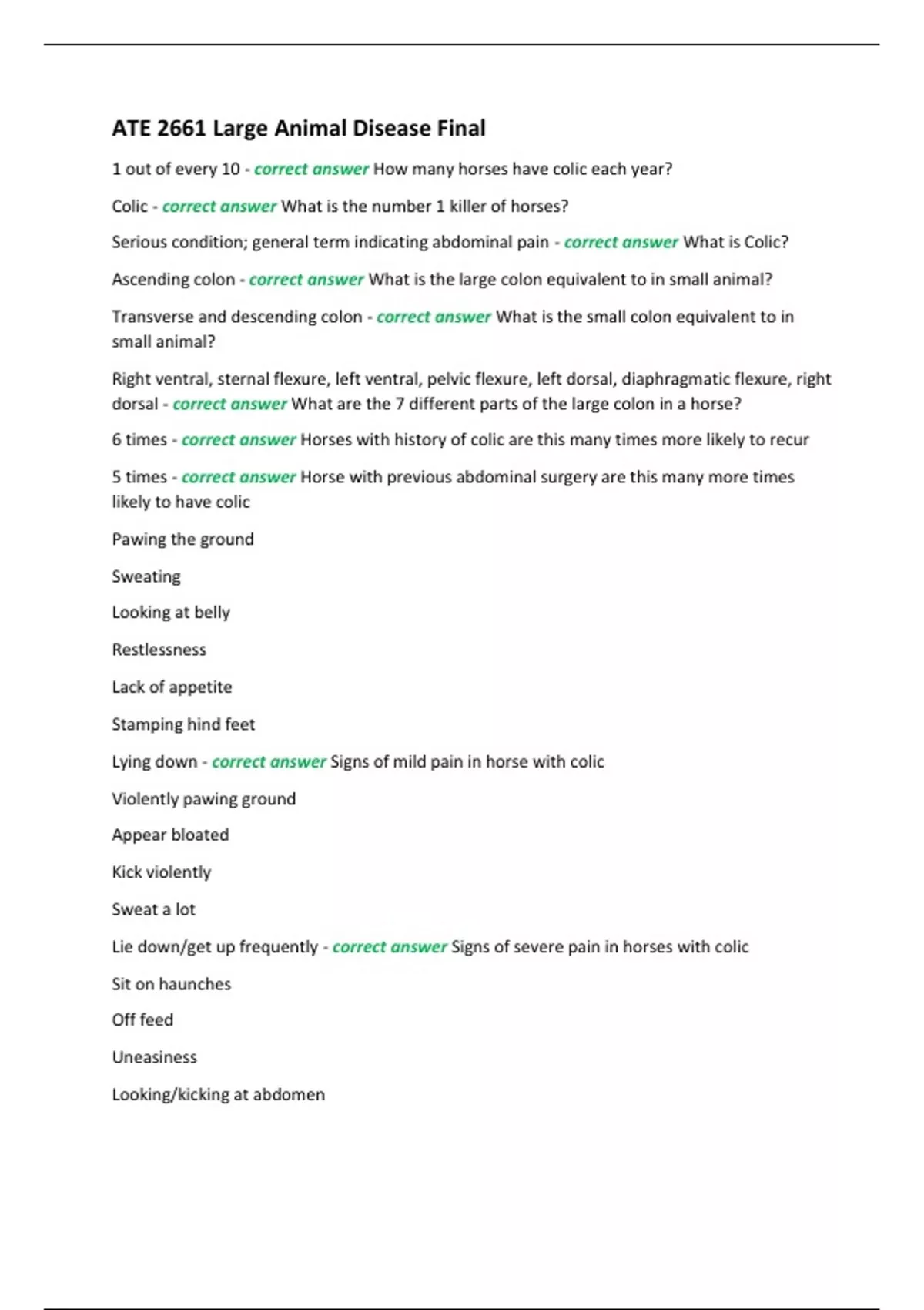 1 out of every 10 - correct answer How many horses have colic each year? Colic - correct answer What is the number 1 killer of horses? Serious condition; general term indicating abdominal pain - correct answer What is Colic? Ascending colon - correct answer What is the large colon equivalent to in small animal? Transverse and descending colon - correct answer What is the small colon equivalent to in small animal? Right ventral, sternal flexure, left ventral, pelvic flexure, left dorsal, diaphragmatic flexure, right dorsal - correct answer What are the 7 different parts of the large colon in a horse? 6 times - correct answer Horses with history of colic are this many times more likely to recur 5 times - correct answer Horse with previous abdominal surgery are this many more times likely to have colic Pawing the ground