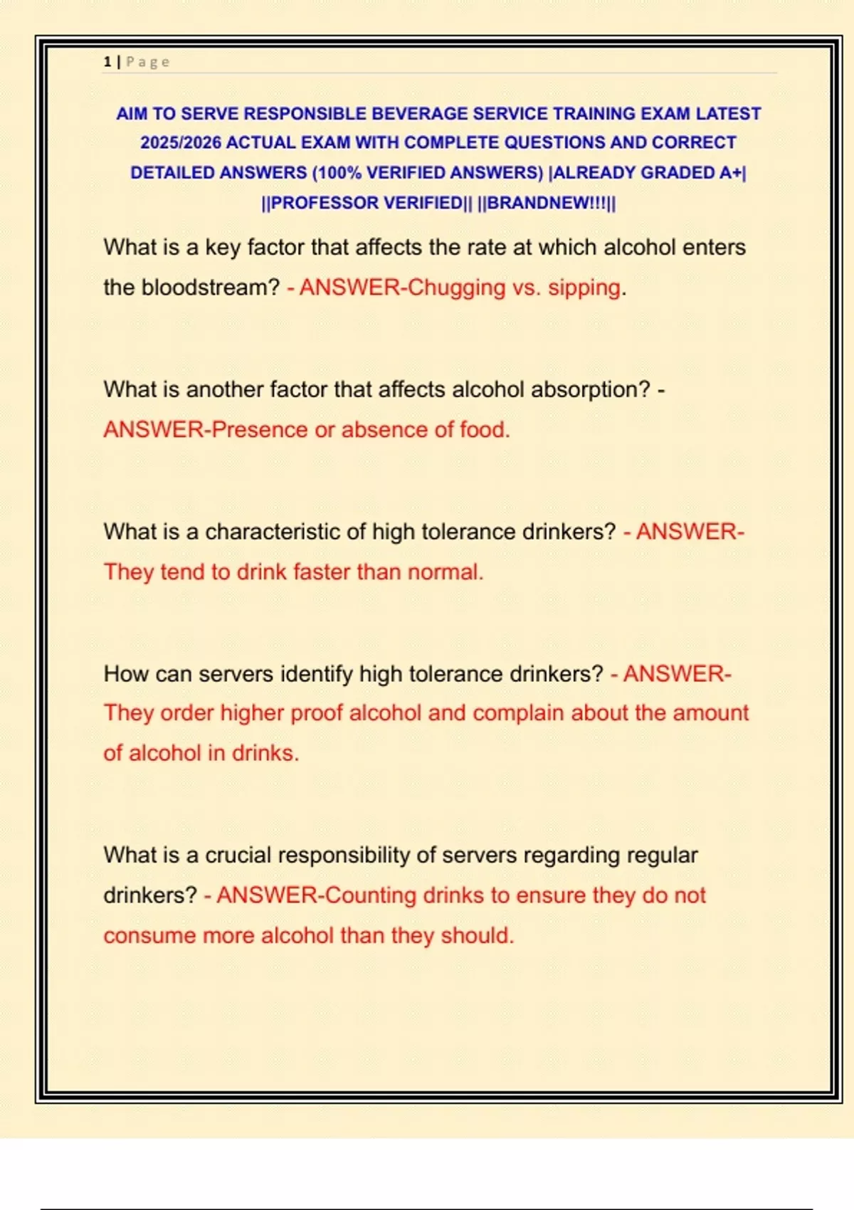 AIM TO SERVE RESPONSIBLE BEVERAGE SERVICE TRAINING EXAM LATEST