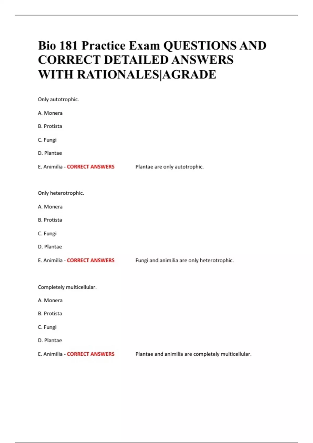 Summary Bio 181 Practice Exam QUESTIONS AND CORRECT DETAILED ANSWERS WITH RATIONALES|AGRADE