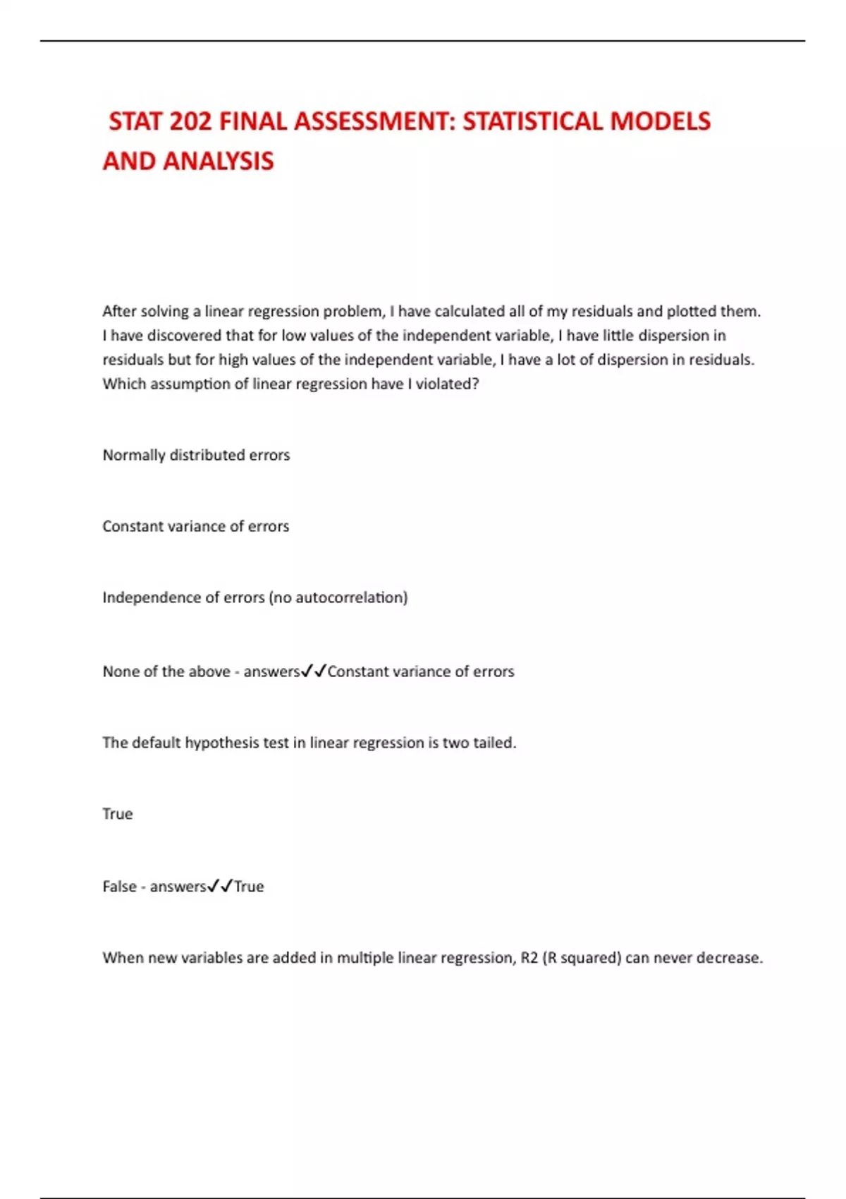 None of the above - answers✔✔Constant variance of errors