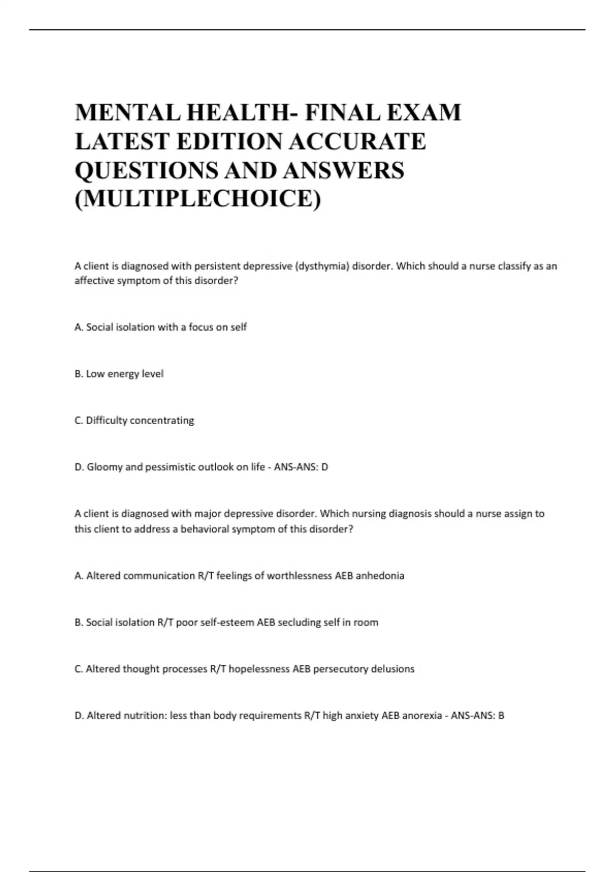 , D. Depression is a result of negative thinking. - ANS-ANS: C