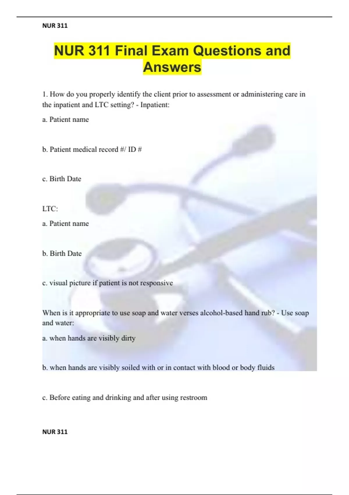 NUR 311 Final Exam Questions and