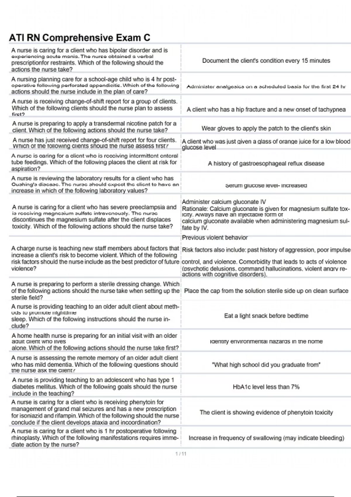 A nurse is caring for a client who has bipolar disorder and is experiencing acute mania. The nurse obtained a verbal prescription for restraints. Which of the following should the actions the nurse take? A nursing planning care for a school-age child who is 4 hr postoperative following perforated appendicitis. Which of the following actions should the nurse include in the plan of care? A nurse is receiving change-of-shift report for a group of clients. Which of the following clients should the nurse plan to assess first? A nurse is preparing to apply a transdermal nicotine patch for a client. Which of the following actions should the nurse take? A nurse has just received change-of-shift report for four clients. Which of the following clients should the nurse assess first? A nurse is caring for a client who is receiving intermittent enteral tube feedings. Which of the following places the client at risk for aspiration? A nurse is reviewing the laboratory results for a client who has Cushing's disease. The nurse should expect the client to have an increase in which of the following laboratory values? A nurse is caring for a client who has severe preeclampsia and is receiving magnesium sulfate intravenously. The nurse discontinues the magnesium sulfate after the client displaces toxicity. Which of the following actions should the nurse take? A charge nurse is teaching new staff members about factors that increase a client's risk to become violent. Which of the following Document the client's condition every 15 minutes Administer analgesics on a scheduled basis for the first 24 hr A client who has a hip fracture and a new onset of tachypnea Wear gloves to apply the patch to the client's skin A client who was just given a glass of orange juice for a low blood glucose level A history of gastroesophageal reflux disease Serum glucose level- increased Administer calcium gluconate IV Rationale: Calcium gluconate is given for magnesium sulfate toxicity. Always have an injectable form of calcium gluconate available when administering magnesium sulfate by IV. Previous violent behavior Risk factors also include: past history of aggression, poor impulse risk factors should the nurse include as the best predictor of future control, and violence. Comorbidity that leads to acts of violence violence? A nurse is preparing to perform a sterile dressing change. Which of the following actions should the nurse take when setting up the sterile field? A nurse is providing teaching to an older adult client about methods to promote nighttime sleep. Which of the following instructions should the nurse include? A home health nurse is preparing for an initial visit with an older adult client who lives alone. Which of the following actions should the nurse take first? A nurse is assessing the remote memory of an older adult client who has mild dementia. Which of the following questions should the nurse ask the client? A nurse is providing teaching to an adolescent who has type 1 diabetes mellitus. Which of the following goals should the nurse include in the teaching? A nurse is caring for a client who is receiving phenytoin for management of grand mal seizures and has a new prescription for isoniazid and rifampin. Which of the following should the nurse conclude if the client develops ataxia and incoordination? A nurse is caring for a client who is 1 hr postoperative following rhinoplasty. Which of the following manifestations requires immediate action by the nurse? (psychotic delusions, command hallucinations, violent angry reactions with cognitive disorders). Place the cap from the solution sterile side up on clean surface Eat a light snack before bedtime Identify environmental hazards in the home "What high school did you graduate from" HbA1c level less than 7% The client is showing evidence of phenytoin toxicity Increase in frequency of swallowing (may indicate bleeding) 2 / 11 A nurse is planning care for a preschool-age child who is in the acute phase Kawasaki disease. Which of the following interventions should the nurse include in the plan of care? A nurse is planning an educational program for high school students about cigarette smoking. Which of the following potential consequences of smoking is most likely to discourage adolescents from using tobacco? A nurse is assessing a client who is prescribed spironolactone. Which of the following laboratory values should the nurse monitor for this client? A nurse has agreed to serve as an interpreter for an older adult Monitor the child's cardiac status Use of tobacco decreases the level of athletic ability Serum potassium- diuretic that retains potassium= hyperkalemic client who is assigned to another nurse. Which of the following statements by the nurse indicates an understanding of this role? A nurse is performing assessments on newborns in the nursery. Which of the following findings should the nurse report to the provider? A nurse on an acute unit has received change of shift report for 4 clients which of the following clients should the nurse assess first? Pain pallor pulselessness paresthesia A nurse is providing discharge instructions to a client who has a new prescription for haloperidol which of the following adverse effects should the nurse instruct the client to report to the provider? A nurse is planning discharge teaching about cord care for the parents of a newborn which of the following instructions should the nurse plan to include in the teaching? A nurse is teaching dietary guidelines to a client who has celiac disease which of the following food choices is appropriate for the client? A nurse is working in acute care mental health facility is assessing a client who has schizophrenia. Which of the following findings should the nurse expect? A nurse is caring for a client who is immobile which of the following interventions is appropriate to prevent contracture? A public health nurse working in a rural area is developing a program to improve health fo