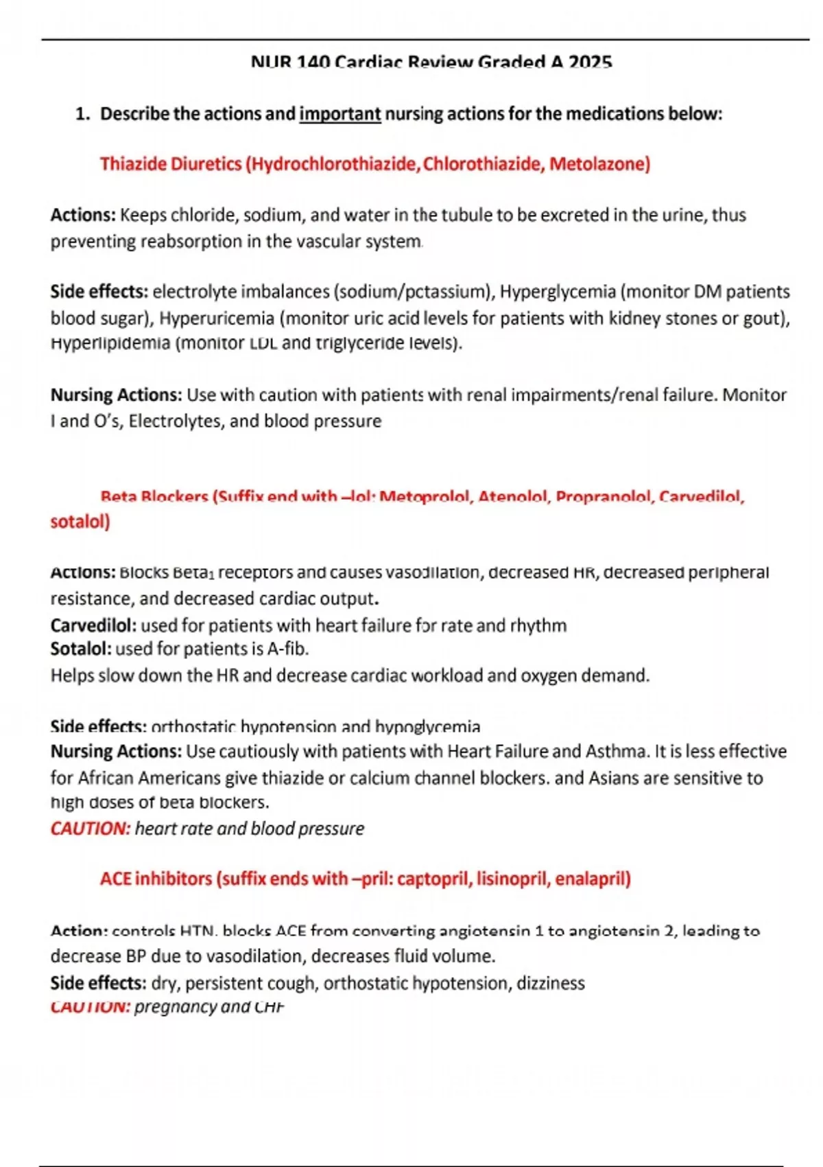 1. Describe the actions and important nursing actions for the medications below: Thiazide Diuretics (Hydrochlorothiazide, Chlorothiazide, Metolazone) Actions: Keeps chloride, sodium, and water in the tubule to be excreted in the urine, thus preventing reabsorption in the vascular system. Side effects: electrolyte imbalances (sodium/potassium), Hyperglycemia (monitor DM patients blood sugar), Hyperuricemia (monitor uric acid levels for patients with kidney stones or gout), Hyperlipidemia (monitor LDL and triglyceride levels). Nursing Actions: Use with caution with patients with renal impairments/renal failure. Monitor I and O’s, Electrolytes, and blood pressure Beta Blockers (Suffix end with –lol: Metoprolol, Atenolol, Propranolol, Carvedilol, sotalol) Actions: Blocks Beta1 receptors and causes vasodilation, decreased HR, decreased peripheral resistance, and decreased cardiac output. Carvedilol: used for patients with heart failure for rate and rhythm Sotalol: used for patients is A-fib. Helps slow down the HR and decrease cardiac workload and oxygen demand. Side effects: orthostatic hypotension and hypoglycemia Nursing Actions: Use cautiously with patients with Heart Failure and Asthma. It is less effective for African Americans give thiazide or calcium channel blockers. and Asians are sensitive to high doses of beta blockers. CAUTION: heart rate and blood pressure ACE inhibitors (suffix ends with –pril: captopril, lisinopril, enalapril) Action: controls HTN. blocks ACE from converting angiotensin 1 to angiotensin 2, leading to decrease BP due to vasodilation, decreases fluid volume. Side effects: dry, persistent cough, orthostatic hypotension, dizziness CAUTION: pregnancy and CHF ARB’s (Suffix ends with –sartan: losartan) Action: Angiotensin receptor blocker: reduces BP, workload, and O2 demand. Used for pts with HTN, Diabetes, Renal disease, HF Side effects: headache, dizziness, syncope, weakness, abdominal pain. CAUTION: hypovolemia Calcium Channel Blockers (suffix ends with –dipine: Nifedipine, Amlodipine, Amiodarone) Action: inhibits movements of calcium ions across calcium membranes reduces contractility: treatment for hypertension. Used for pts who cannot tolerate Beta blockers, pts with heart failure, can also prevent coronary artery spasm. Side effects: headache, dizziness, syncope, weakness, nausea, abdominal pain, Erectile dysfunction. CAUTION: CAD, renal, or hepatic dysfunction. Loop Diuretics (bumetanide, furosemide, and torsemide) (potassium-sparing diuretics amiloride, spironolactone, and triamterene) Action: blocks chloride pump which decreases sodium & water. treatment of hypertension or edema due to HF or other causes. Potassium-sparing diuretics have weak diuretic and antihypertensive properties and are used mainly to conserve potassium in patients receiving thiazide or loop diuretics. Side effects: hypokalemia, dehydration, hyponatremia, hypoglycemia CAUTION: pt. with renal or hepatic disease