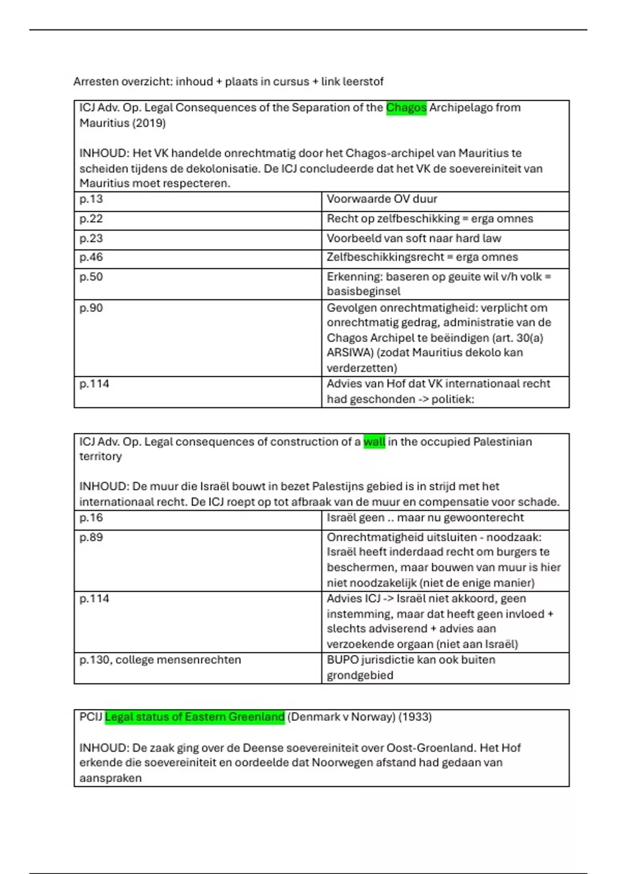 Dit document heb ik steeds gebruikt tijdens het studeren. In het document vind je alle key cases / arresten van volkenrecht met per case een korte uitleg zodat je mee bent + een verwijzing in de cursus. Het heeft mij heel erg geholpen, dus hopelijk jou ook. Ik gebruikte het ook vaak op het einde van de dag om zo eens kort te herhalen door af te dekken.