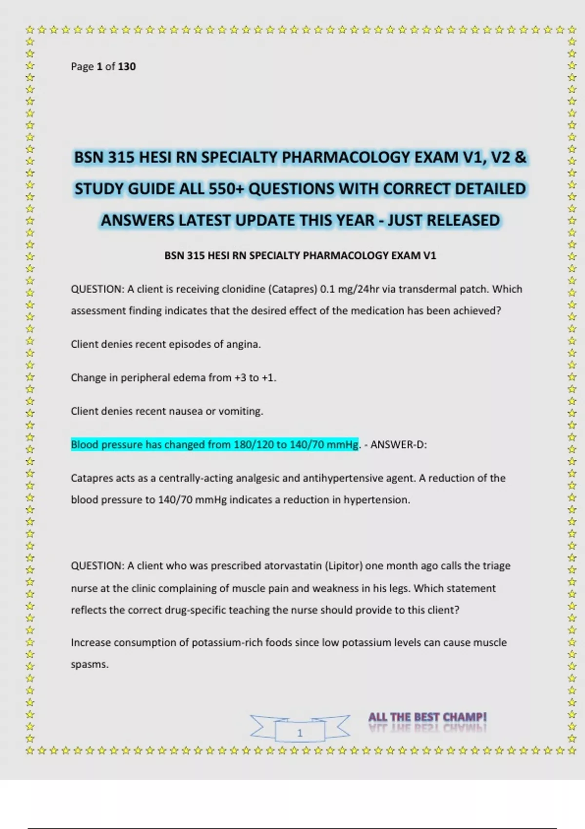 BSN 315 HESI RN SPECIALTY PHARMACOLOGY EXAM V1, V2 &