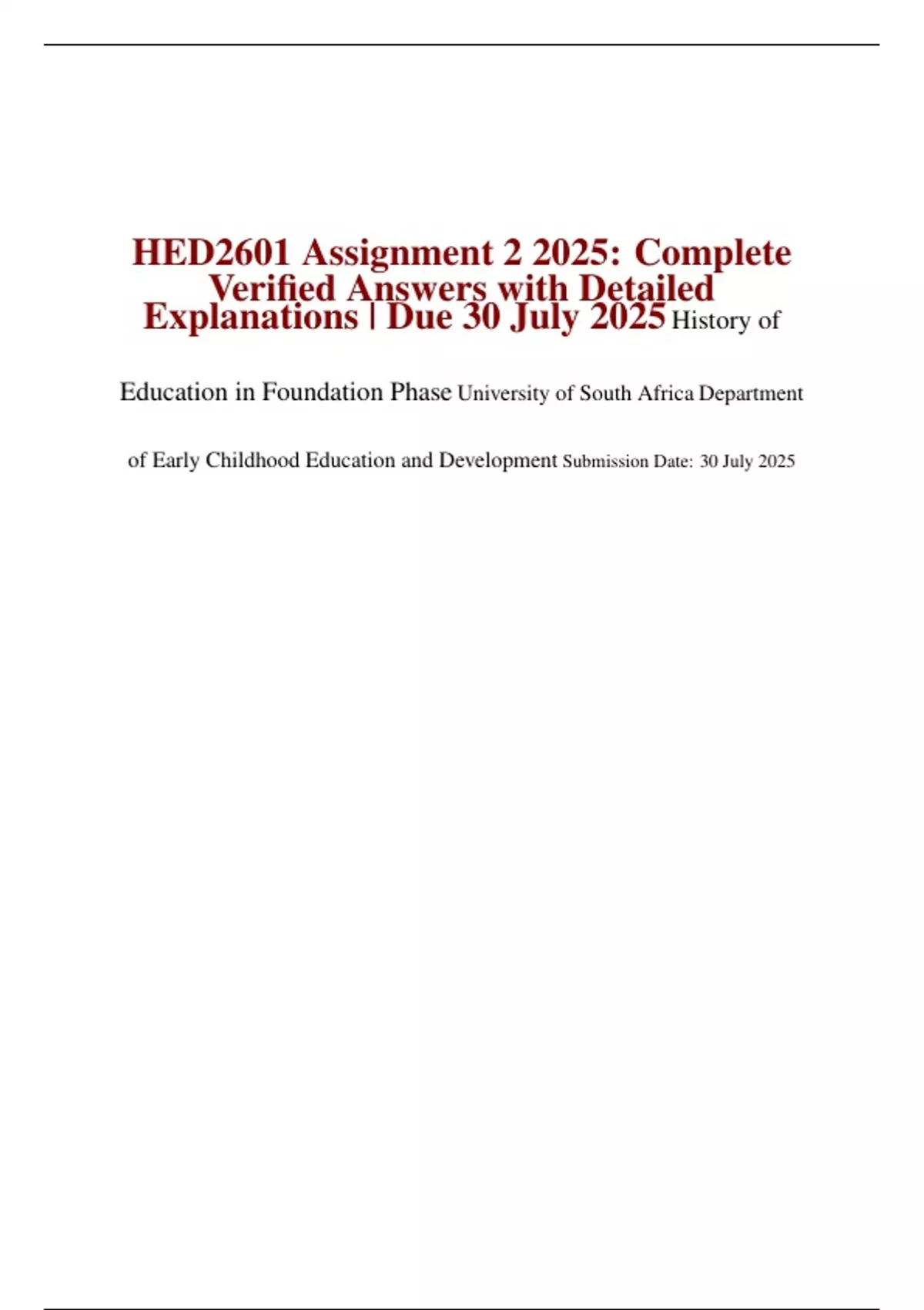 HED2601 Assignment 2 2025: Complete Verified Answers with Detailed Explanations | Due 30 July 2025Historyof Education in Foundation PhaseUniversity of South AfricaDepartment of Early Childhood Education and Development Submission Date: 30 July 2025