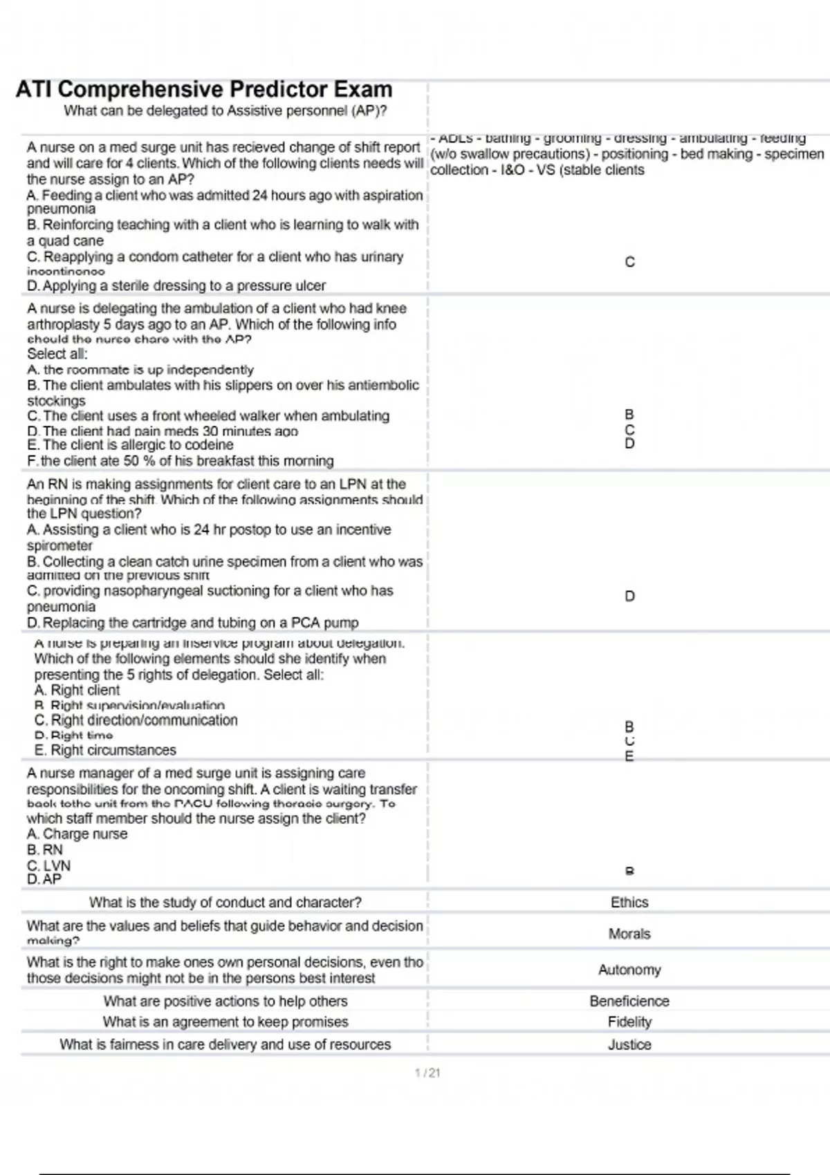 ATI Comprehensive Predictor Exam What can be delegated to Assistive personnel (AP)? A nurse on a med surge unit has recieved change of shift report and will care for 4 clients. Which of the following clients needs will the nurse assign to an AP? A. Feeding a client who was admitted 24 hours ago with aspiration pneumonia B. Reinforcing teaching with a client who is learning to walk with a quad cane C. Reapplying a condom catheter for a client who has urinary incontinence D. Applying a sterile dressing to a pressure ulcer A nurse is delegating the ambulation of a client who had knee arthroplasty 5 days ago to an AP. Which of the following info should the nurse share with the AP? Select all: A. the roommate is up independently B. The client ambulates with his slippers on over his antiembolic stockings C. The client uses a front wheeled walker when ambulating D. The client had pain meds 30 minutes ago E. The client is allergic to codeine F. the client ate 50 % of his breakfast this morning An RN is making assignments for client care to an LPN at the beginning of the shift. Which of the following assignments should the LPN question? A. Assisting a client who is 24 hr postop to use an incentive spirometer B. Collecting a clean catch urine specimen from a client who was admitted on the previous shift C. providing nasopharyngeal suctioning for a client who has pneumonia D. Replacing the cartridge and tubing on a PCA pump A nurse is preparing an inservice program about delegation. Which of the following elements should she identify when presenting the 5 rights of delegation. Select all: A. Right client B. Right supervision/evaluation C. Right direction/communication D. Right time E. Right circumstances A nurse manager of a med surge unit is assigning care responsibilities for the oncoming shift. A client is waiting transfer back to the unit from the PACU following thoracic surgery. To which staff member should the nurse assign the client? A. Charge nurse B. RN C. LVN D. AP - ADLs - bathing - grooming - dressing - ambulating - feeding (w/o swallow precautions) - positioning - bed making - specimen collection - I&O - VS (stable clients C B C D D B C E B What is the study of conduct and character? What are the values and beliefs that guide behavior and decision making? What is the right to make ones own personal decisions, even tho those decisions might not be in the persons best interest What are positive actions to help others What is an agreement to keep promises What is fairness in care delivery and use of resources Ethics Morals Autonomy Beneficience Fidelity Justice 2 / 21 What is avoidance of harm or injury A nurse is caring for a client who decides not to have surgery despite significant blockages in his coronary arteries. The nurse understands that this clients choice is an example of what principles? A. Fidelity B. Autonomy C. Justice D. Nonmalificience A nurse offers pain meds to a client who is postop prior to ambulation. The nurse understands that this aspect of care delivery is an example of which of the following ethical principles? A. Fidelity B. Autonomy C. Justice D. Beneficience A nurse is instructing a group of nursing students about the responsibilities involved with organ donation and procurement. When the nurse explains that all clients waiting for a kidney transplant have to meet the same qualifications, the students should understand that this aspect of care delivery is an example of which ethical principle A. Fidelity B. Autonomy C. Justice D. Nonmaleficence A nurse questions a med prescription as too extreme and light of the clients advanced age and unstable status. The nurse understands that this action is an example of which ethical principle A. Fidelity B. Autonomy C. Justice D. Nonmalificence Which of the following situations can be identified as an ethical dilemma? A. A nurse on a med surge unit demonstrates signs of chemical impairment B. A nurse over hears another nurse telling an older adult client that if he doesnt stay in bed she will restrain him C. A family has conflicting feelings about the initiation of enteral tube feedings of their father who is terminally ill D. A client who is terminally ill hesitates to name her spouse on her durable power of attorney form Most managers can be categorized as makes decisions of the group motivates by coercion communication occurs down the chain of command Work output by the staff is usually high-good for crisis situations and bureaucratic settings includes the group when decisions are made Motivates by supporting star achievements Communication occurs up and down the chain of command Work output by staff is usually of good quality-good when cooperation and collaboration is necessary makes very few decisions and does little planning motivation is largely the responsibility of individuals staff members Communication occurs up and down the chain of command and between group members Non-maleficence A D C D C authoritative, democratic, and laissez faire Authoritative Democratic Laissez faire