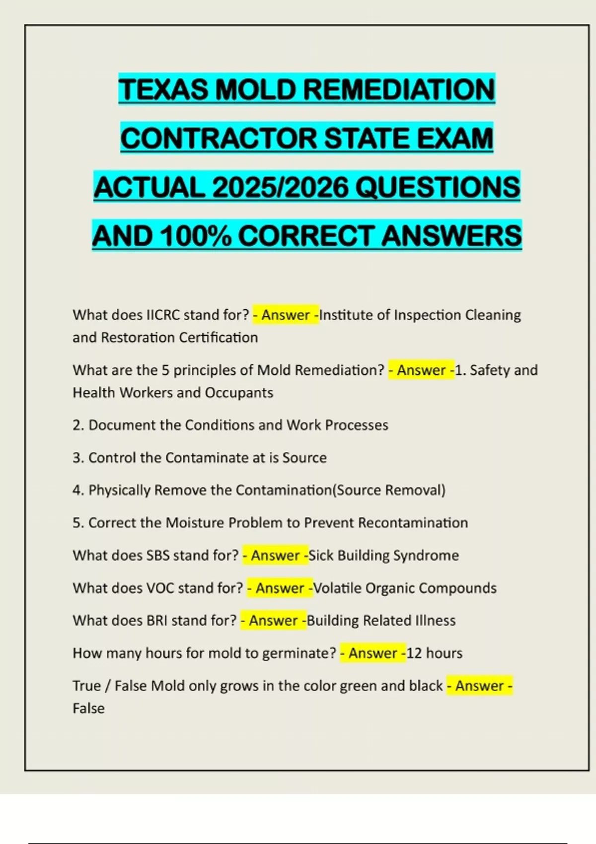 TEXAS MOLD REMEDIATION CONTRACTOR STATE EXAM ACTUAL 2025/2026 QUESTIONS AND 100% CORRECT ANSWERS What does IICRC stand for? - Answer -Institute of Inspection Cleaning and Restoration Certification What are the 5 principles of Mold Remediation? - Answer -1. Safety and Health Workers and Occupants 2. Document the Conditions and Work Processes 3. Control the Contaminate at is Source 4. Physically Remove the Contamination(Source Removal) 5. Correct the Moisture Problem to Prevent Recontamination What does SBS stand for? - Answer -Sick Building Syndrome What does VOC stand for? - Answer -Volatile Organic Compounds What does BRI stand for? - Answer -Building Related Illness How many hours for mold to germinate? - Answer -12 hours True / False Mold only grows in the color green and black - Answer - FalseThe release of spores is called... - Answer -Sporulation What 3 resources do mold colonies need in order to grow? - Answer -1. Food 2. Moisture 3. Temperature Range Growth occurring to noticeable or detectable levels is called... - Answer -Amplification What are 3 common areas mold can be found? - Answer -1. HVAC 2. Condensate Drain Pipe 3. Vapor Barriers What are the 4 potential Health