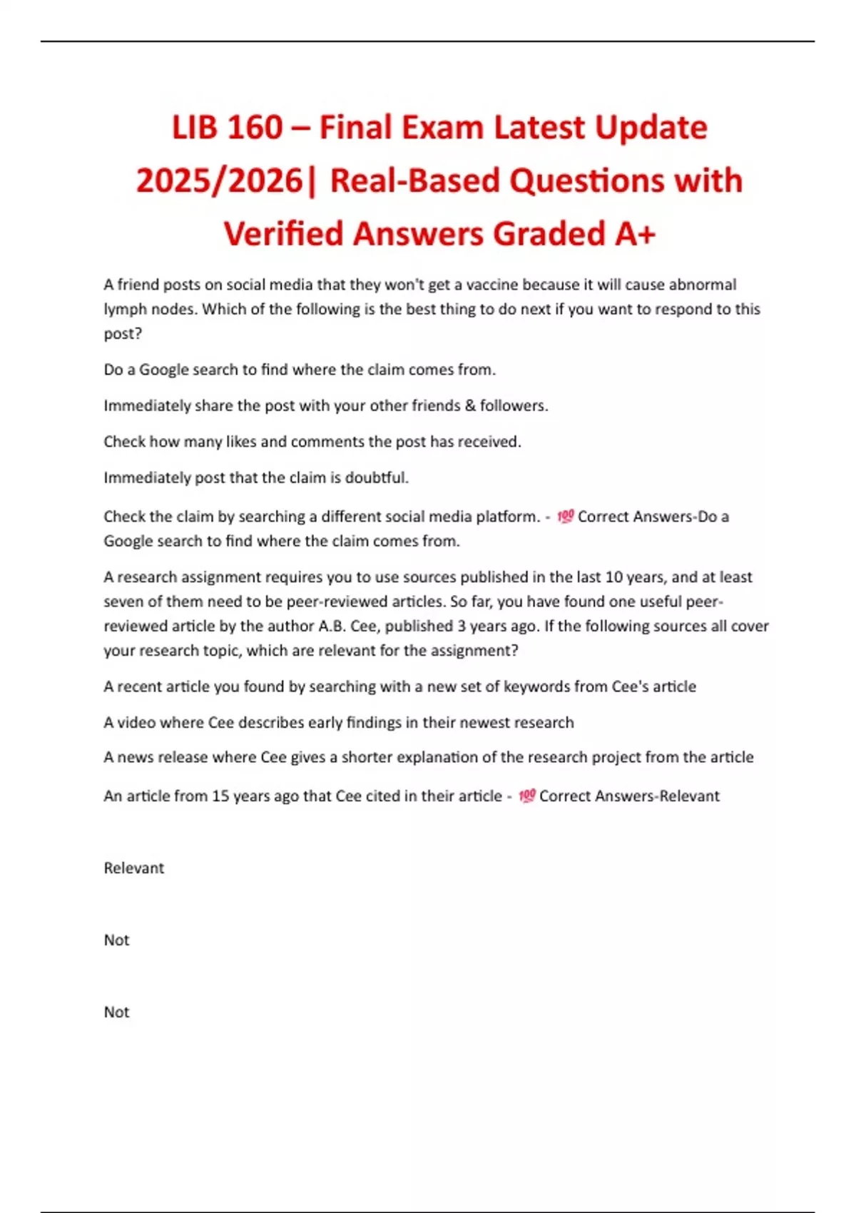 LIB 160 – Final Exam Latest Update 2025/2026| Real-Based Questions with Verified Answers Graded A+ A friend posts on social media that they won't get a vaccine because it will cause abnormal lymph nodes. Which of the following is the best thing to do next if you want to respond to this post? Do a Google search to find where the claim comes from. Immediately share the post with your other friends & followers. Check how many likes and comments the post has received. Immediately post that the claim is doubtful. Check the claim by searching a different social media platform. - Correct Answers-Do a Google search to find where the claim comes from. A research assignment requires you to use sources published in the last 10 years, and at least seven of them need to be peer-reviewed articles. So far, you have found one useful peerreviewed article by the author A.B. Cee, published 3 years ago. If the following sources all cover your research topic, which are relevant for the assignment? A recent article you found by searching with a new set of keywords from Cee's article A video where Cee describes early findings in their newest research A news release where Cee gives a shorter explanation of the research project from the article An article from 15 years ago that Cee cited in their article - Correct Answers-Relevant Relevant Not Not According to Chapter 2 each of the three major finding tools helps you find specific types of resources. Which one of the finding tools listed on the drop-down menu is the best choice for finding... wordbank-(Indexes and databases, Web search engines, Library discovery tools) in-depth research articles on a specific topic up-to-date information and news resources that a specific library owns - Correct Answers-Indexes and databases Web search engine Library discovery According to Chapter 2, which of the following can you do with Quick Search? Access all features even if you're not logged in Search for laptops and other equipment to check out. Use advanced search filters Search for e-books - Correct Answers-No No Yes Yes According to Chapter 4, does a website with a top-level domain of .com need to be evaluated? Yes, because domain tells you where a site comes from but doesn't guarantee quality. No, because it's there to do business, not to promote a cause or opinion. No, because it's provided by a respectable communications organization. No, because successful companies are trustworthy. Yes, because it's definitely trying to sell you something. - Correct Answers-Yes, because domain tells you where a site comes from but doesn't guarantee quality.