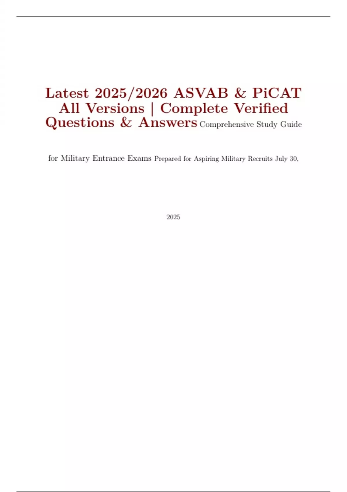 Latest 2025/2026 ASVAB & PiCAT All Versions | Complete Verified Questions & AnswersComprehensiveStudy Guide for Military Entrance Exams Prepared for Aspiring Military Recruits July 30,2025 Introduction This study guide is tailored for the 2025/2026 Armed Services Vocational Aptitude Battery (ASVAB) and Pending Internet Computerized Adaptive Test (PiCAT). These tests evaluate your aptitude for military service and eligibility for various roles. The guide provides 100 verified questions with detailed answers across all subtests: General Science, Arithmetic Reasoning, Word Knowledge, Paragraph Comprehension, Mathematics Knowledge, Electronics Information, Auto and Shop Information, Mechanical Comprehension, and Assembling Objects. The focus is on clear, concise questions with comprehensive explanations to enhance your preparation.