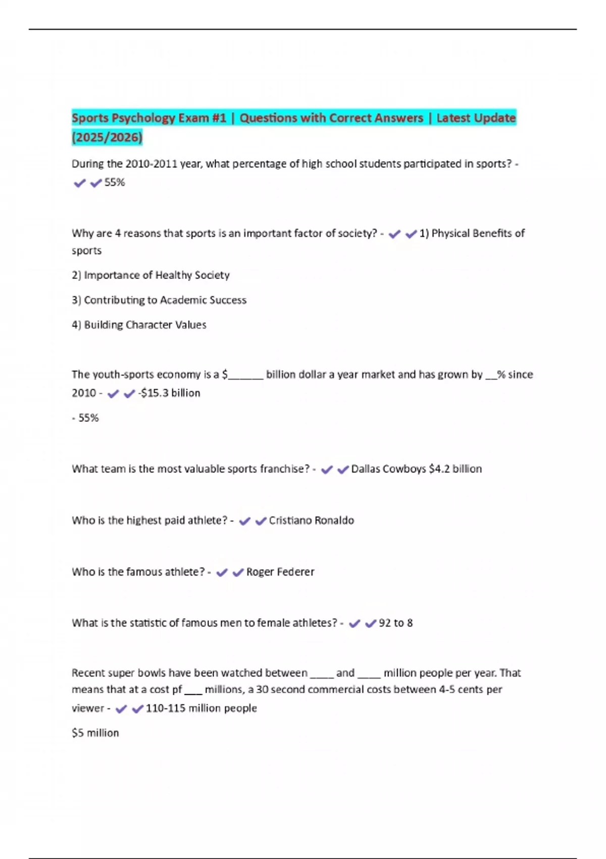 BUNDLE FOR Sports Psychology EXAMS | ALL Questions with Correct Answers | Verified Solutions
