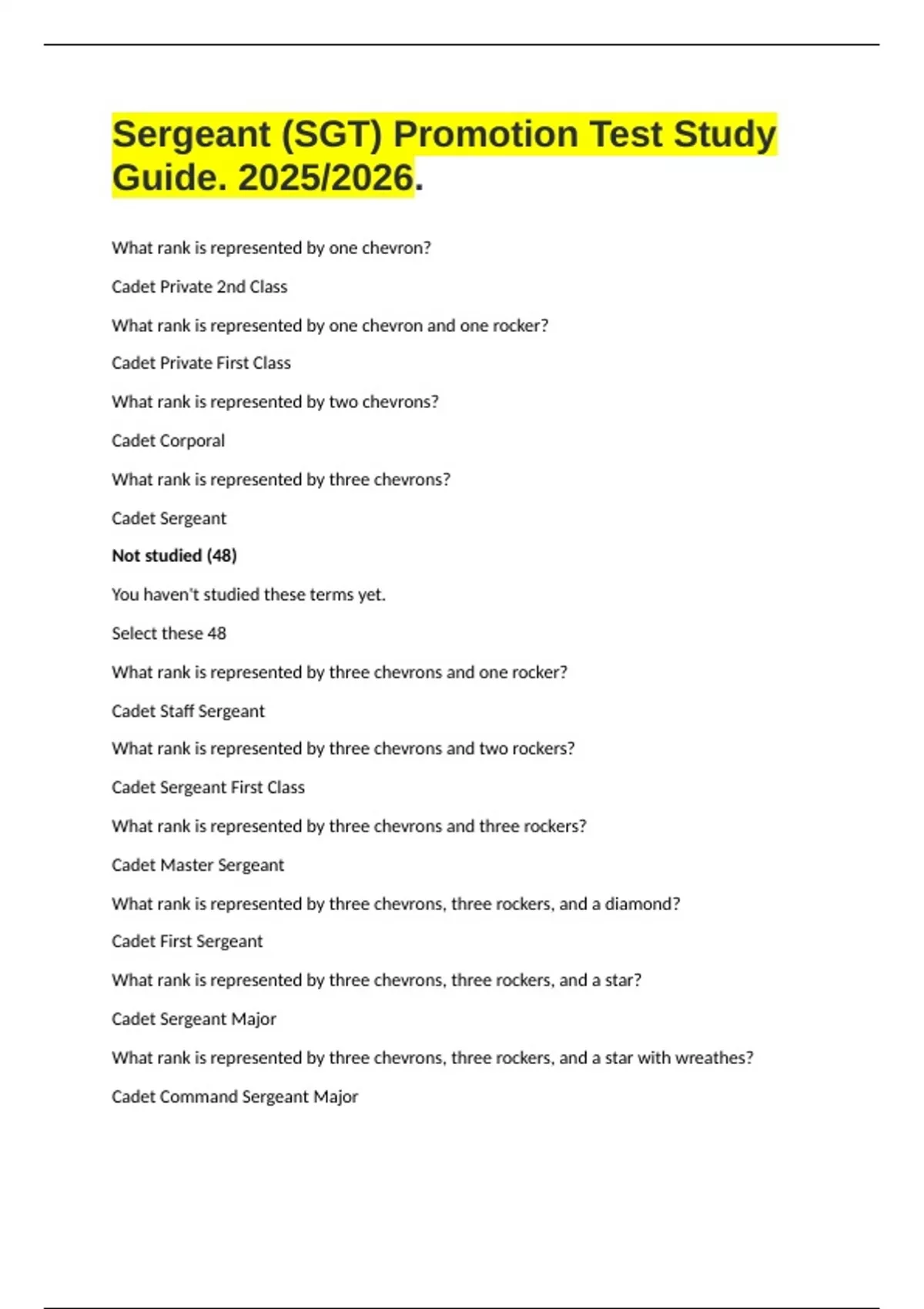 Sergeant (SGT) Promotion Test Study Guide. 2025/2026. What rank is represented by one chevron? Cadet Private 2nd Class What rank is represented by one chevron and one rocker? Cadet Private First Class What rank is represented by two chevrons? Cadet Corporal What rank is represented by three chevrons? Cadet Sergeant Not studied (48)