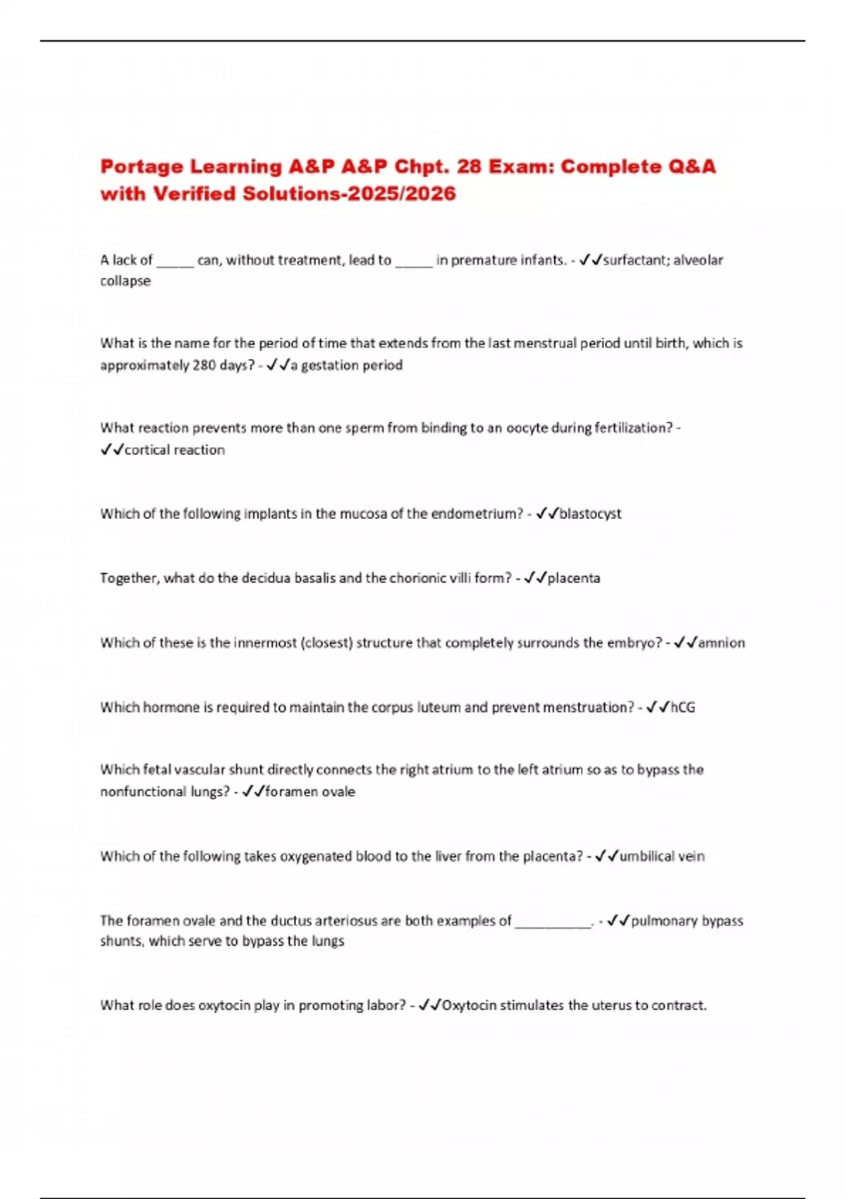 Portage Learning A&P A&P Chpt. 28 Exam: Complete Q&A with Verified Solutions-2025/2026