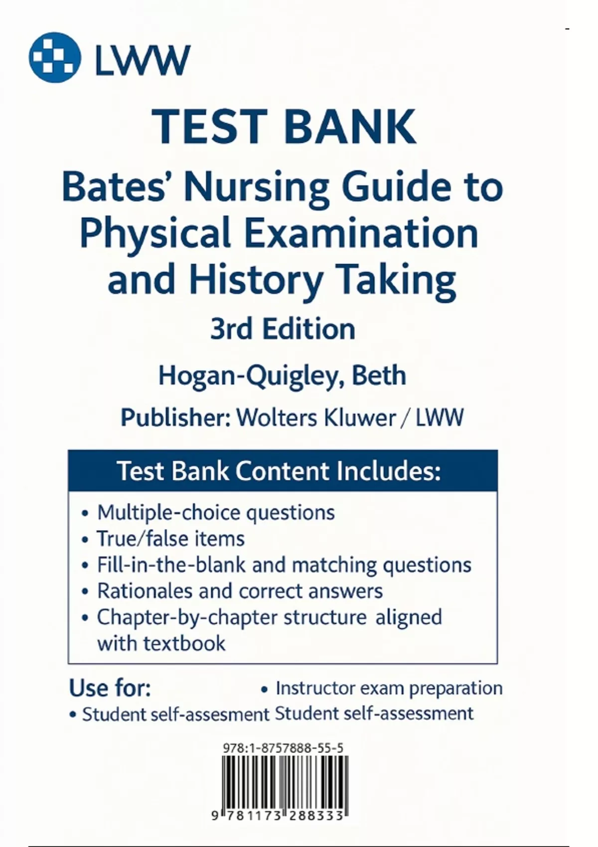 This document provides the full test bank for Bates' Nursing Guide to Physical Examination and History Taking (3rd Edition) by Beth Hogan-Quigley. It includes a comprehensive set of multiple-choice, true/false, and clinical scenario-based questions with accurate answers and rationales. All chapters are covered, including techniques of interviewing, health history collection, general survey, vital signs, and head-to-toe physical assessments for all body systems. It also includes focused assessments for special populations such as pediatric, geriatric, and pregnant patients. This resource is ideal for nursing students preparing for physical assessment exams and clinical practice.
