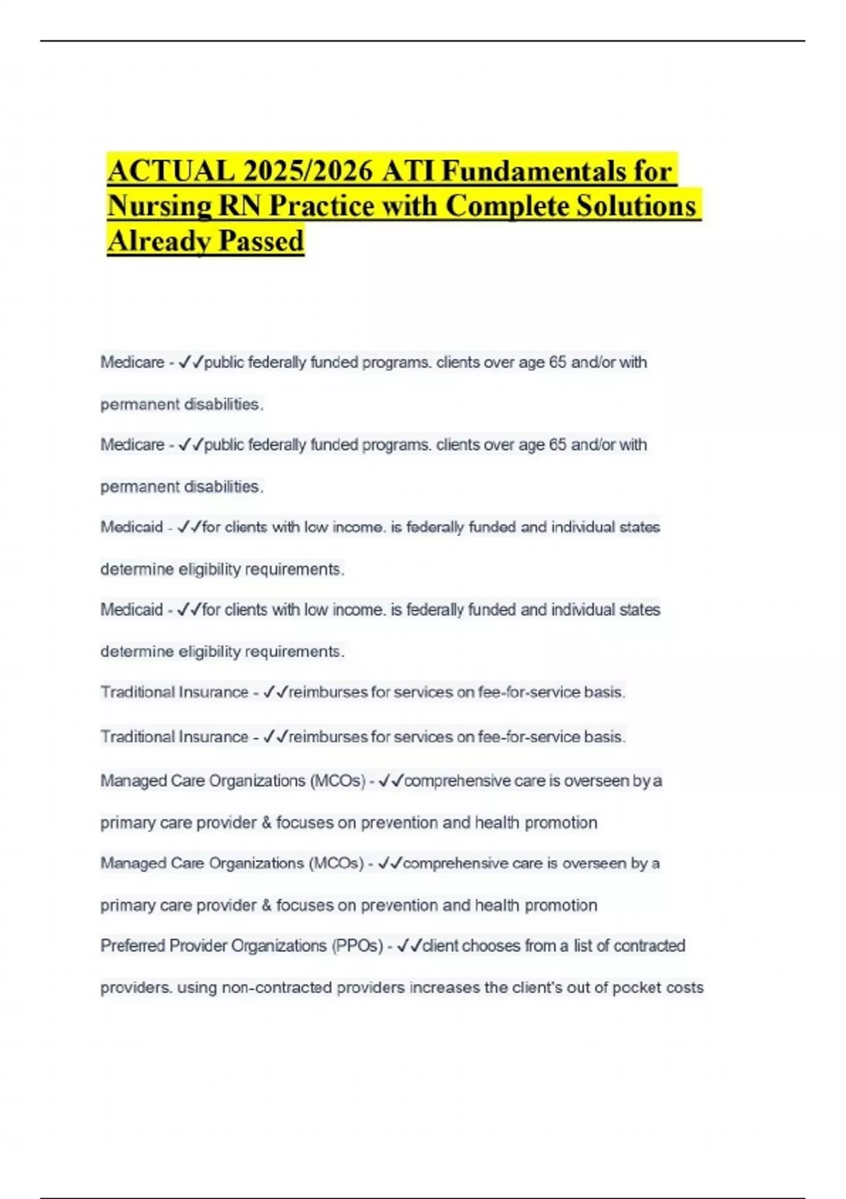 ACTUAL 2025/2026 ATI Fundamentals for Nursing RN Practice with Complete Solutions Already Passed Medicare - ️️public federally funded programs. clients over age 65 and/or with permanent disabilities. Medicare - ️️public federally funded programs. clients over age 65 and/or with permanent disabilities. Medicaid - ️️for clients with low income. is federally funded and individual states determine eligibility requirements. Medicaid - ️️for clients with low income. is federally funded and individual states determine eligibility requirements. Traditional Insurance - ️️reimburses for services on fee-for-service basis. Traditional Insurance - ️️reimburses for services on fee-for-service basis. Managed Care Organizations (MCOs) - ️️comprehensive care is overseen by a primary care provider & focuses on prevention and health promotion Managed Care Organizations (MCOs) - ️️comprehensive care is overseen by a primary care provider & focuses on prevention and health promotion Preferred Provider Organizations (PPOs) - ️️client chooses from a list of contracted providers. using non-contracted providers increases the client's out of pocket costs