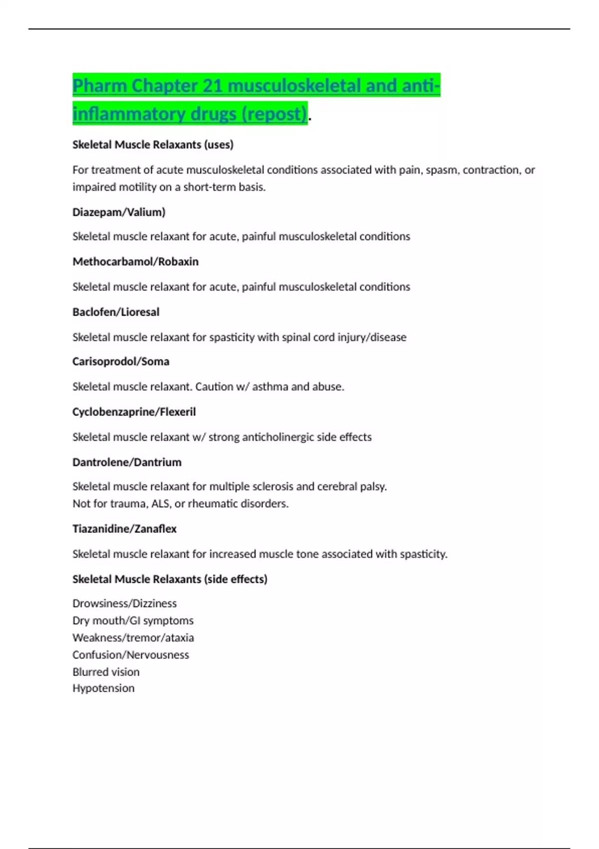 Pharm Chapter 21 musculoskeletal and anti-inflammatory drugs (repost). Skeletal Muscle Relaxants (uses) For treatment of acute musculoskeletal conditions associated with pain, spasm, contraction, or impaired motility on a short-term basis. Diazepam/Valium) Skeletal muscle relaxant for acute, painful musculoskeletal conditions Methocarbamol/Robaxin Skeletal muscle relaxant for acute, painful musculoskeletal conditions Baclofen/Lioresal Skeletal muscle relaxant for spasticity with spinal cord injury/disease Carisoprodol/Soma Skeletal muscle relaxant. Caution w/ asthma and abuse. Cyclobenzaprine/Flexeril Skeletal muscle relaxant w/ strong anticholinergic side effects Dantrolene/Dantrium Skeletal muscle relaxant for multiple sclerosis and cerebral palsy. Not for trauma, ALS, or rheumatic disorders. Tiazanidine/Zanaf