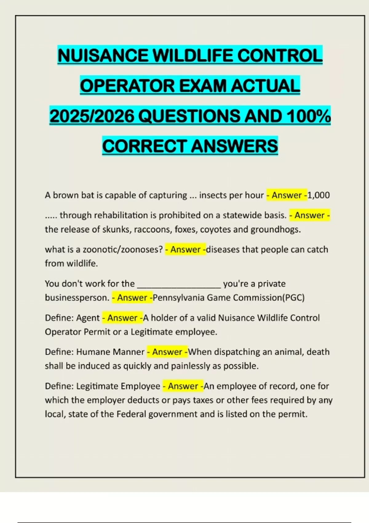 NUISANCE WILDLIFE CONTROL OPERATOR EXAM ACTUAL 2025/2026 QUESTIONS AND 100% CORRECT ANSWERS A brown bat is capable of capturing ... insects per hour - Answer -1,000 ..... through rehabilitation is prohibited on a statewide basis. - Answer - the release of skunks, raccoons, foxes, coyotes and groundhogs. what is a zoonotic/zoonoses? - Answer -diseases that people can catch from wildlife. You don't work for the _________________ you're a private businessperson. - Answer -Pennsylvania Game Commission(PGC) Define: Agent - Answer -A holder of a valid Nuisance Wildlife Control Operator Permit or a Legitimate employee. Define: Humane Manner - Answer -When dispatching an animal, death shall be induced as quickly and painlessly as possible. Define: Legitimate Employee - Answer -An employee of record, one for which the employer deducts or pays taxes or other fees required by any local, state of the Federal government and is listed on the permit.Define: Application - Answer -An application for examination shall be submitted on a form supplied by the Commission. A non-refundable fee of $25 for each test shall be submitted with the application for new agents only. An additional $50 shall be submitted for each permit if the examination is passed. Define: Application Part 2 - Answer -Experience and qualification shall be listed on the application, if applicable, the business business name shall also be included. Conviction of a violation of that act within 5 years of the date of application shall preclude the issuance of a permit, an agent whose permit lapses for 2 or more years shall apply as a new applicant. Records and Reports: - Answer -a record of all activities conducted under authority of the permit can be kept on a form supplied by the Commission according to instructions. Records shall be kept for 3 years & are the basis of any reports required by the Commission. Records are available for inspection during normal business hours. Submit a report by the 10th of each month. Approved Methods: - Answer -foot hold traps, body gripping traps, box traps, clover traps, cage traps, net and snares. shooting with a firearm that will induce death as quickly & painlessly as possible. Dogs used to harass nuisance geese. - Answer -The authorization to harass geese with dogs is prohibited at any time when goslings are present at the site and during the period from June 16-July 20, when majority of adult birds are flightless. Traps used should be: - Answer -tagged, or labeled with the permit number, or trapper I.D. number.Devices shall be checked on by the agent...: - Answer -or property owner at least once each calendar day, but only the AGENT may remove an animal from a trap. Nuisance wildlife should be captured..: - Answer -alive and within 24 hours be dispatched in a humane manner or released in an area open to hunting or trapping. an agent may or may not..: - Answer