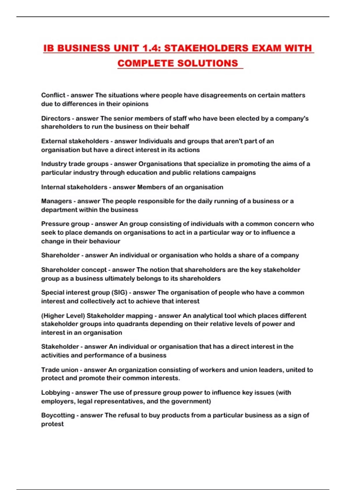 IB BUSINESS UNIT 1.4: STAKEHOLDERS EXAM WITH COMPLETE SOLUTIONS ...
