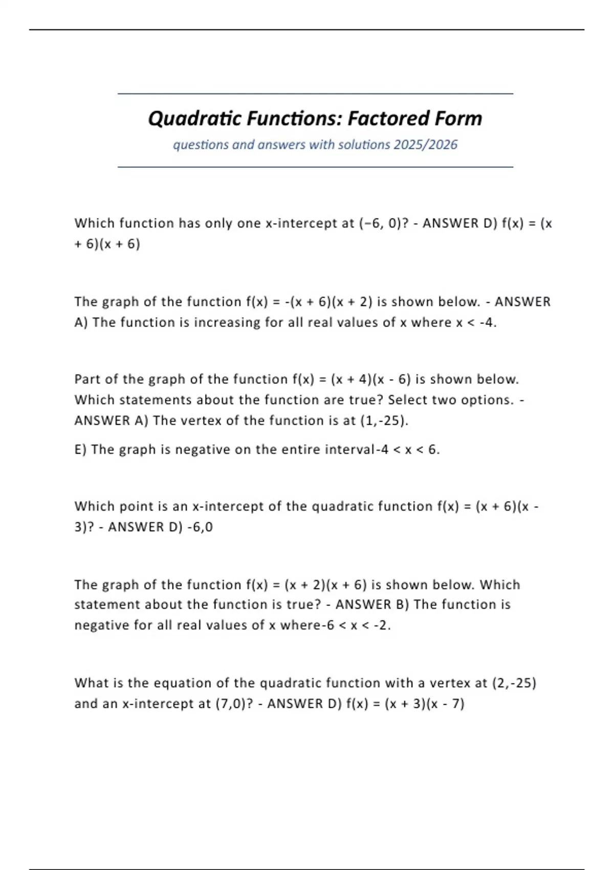 and an x-intercept at (7,0)? - ANSWER D) f(x) = (x + 3)(x - 7)