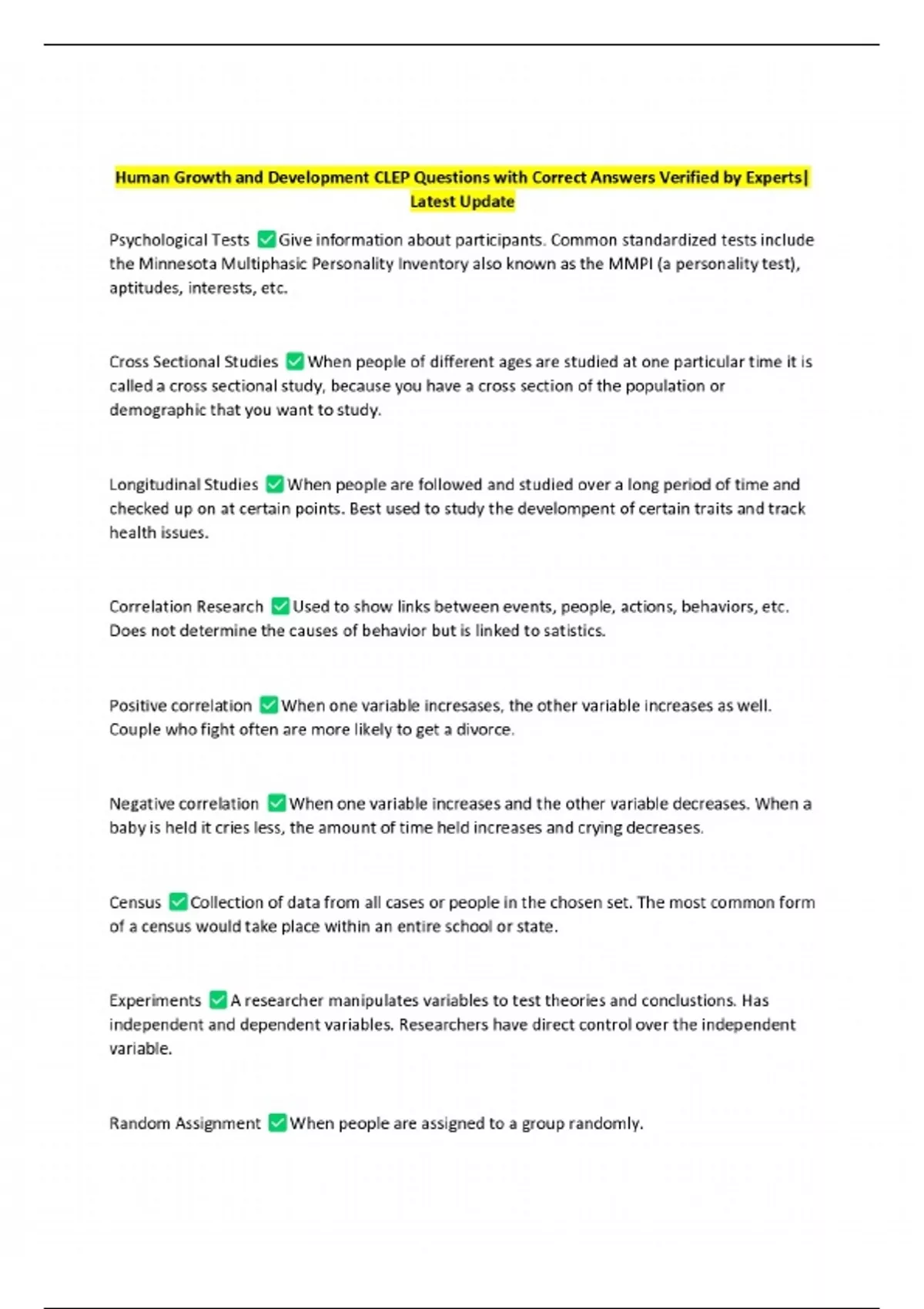 Human Growth and Development CLEP Questions with Correct Answers Verified by Experts| Latest Update