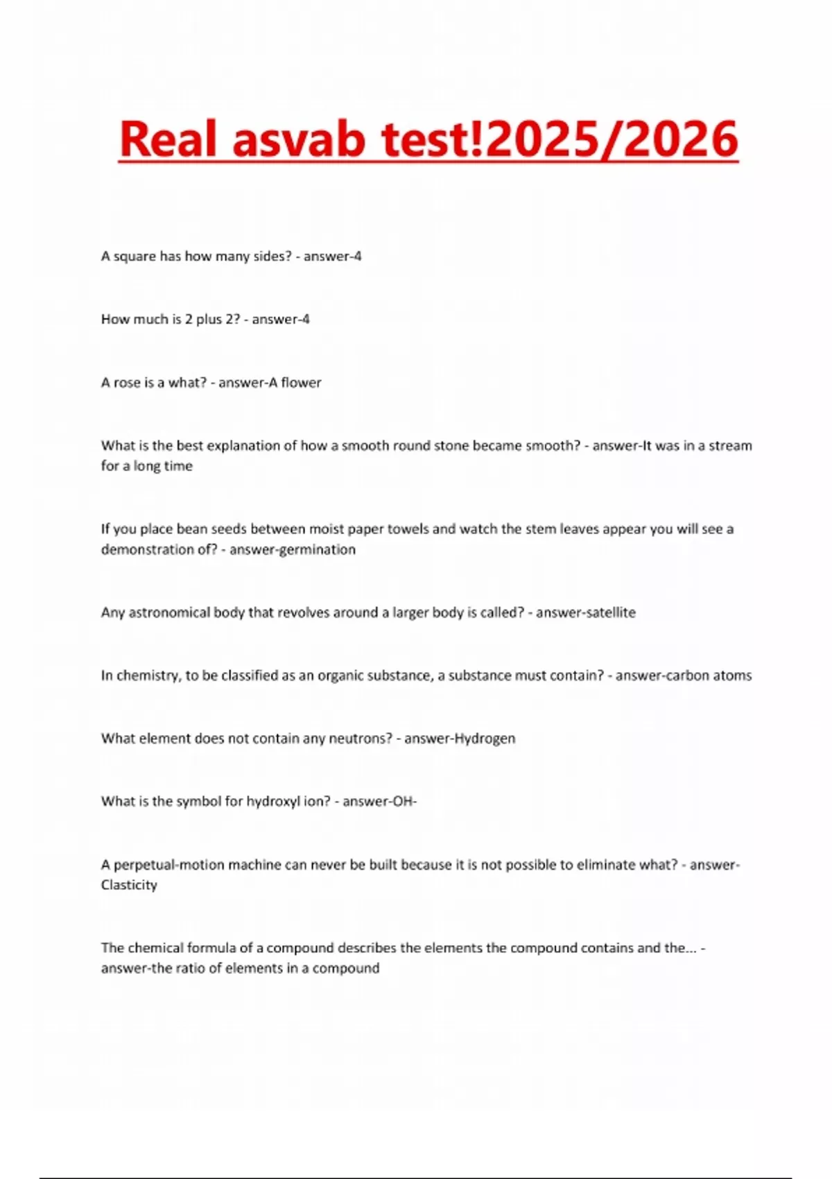 Real asvab test!2025/2026 A square has how many sides? - answer-4 How much is 2 plus 2? - answer-4 A rose is a what? - answer-A flower What is the best explanation of how a smooth round stone became smooth? - answer-It was in a stream for a long time If you place bean seeds between moist paper towels and watch the stem leaves appear you will see a demonstration of? - answer-germination Any astronomical body that revolves around a larger body is called? - answer-satellite In chemistry, to be classified as an organic substance, a substance must contain? - answer-carbon atoms What element does not contain any neutrons? - answer-Hydrogen What is the symbol for hydroxyl ion? - answer-OHA perpetual-motion machine can never be built because it is not possible to eliminate what? - answerClasticity