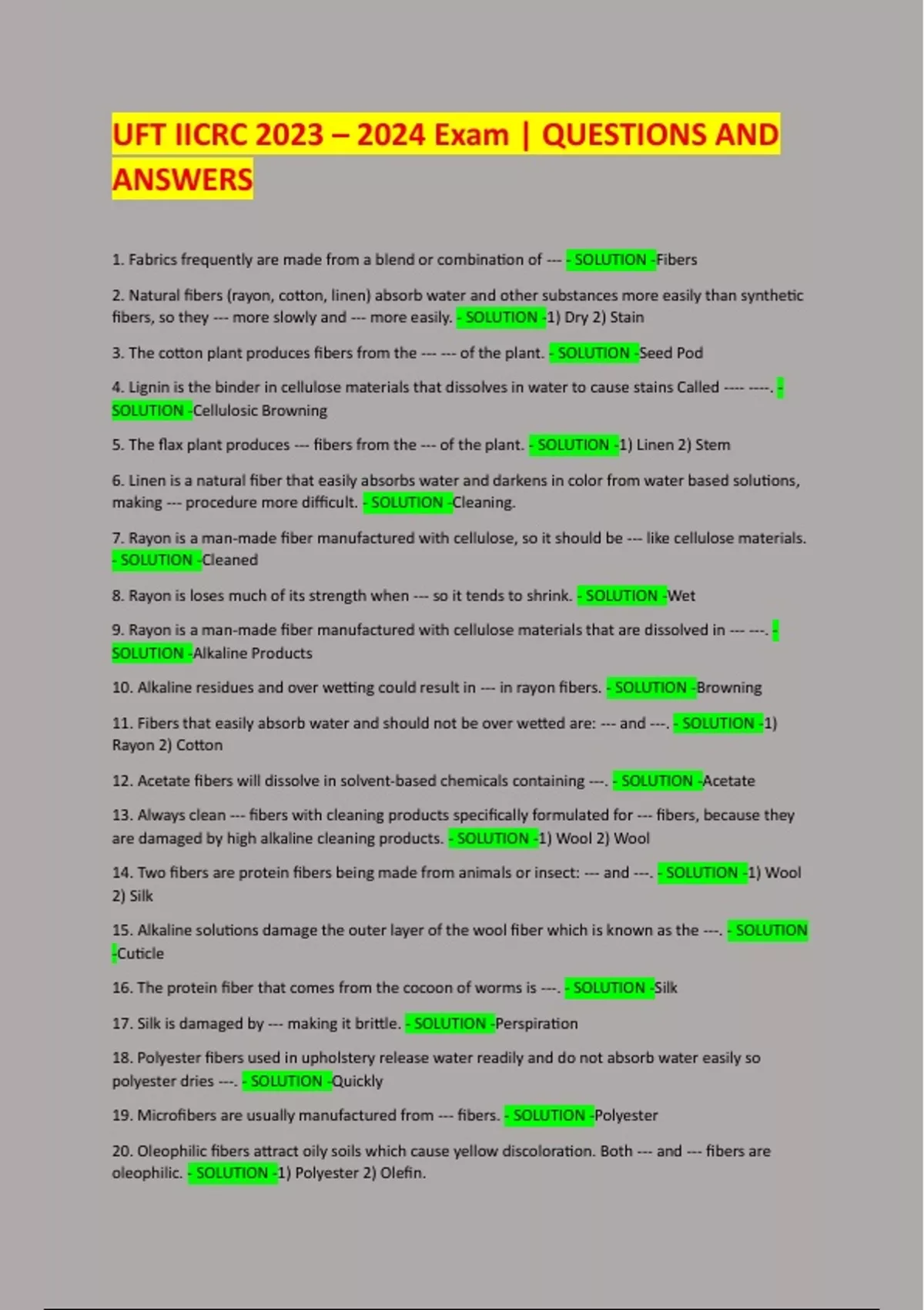 UFT IICRC 2023 – 2024 Exam | QUESTIONS AND ANSWERS 1. Fabrics frequently are made from a blend or combination of --- - SOLUTION -Fibers 2. Natural fibers (rayon, cotton, linen) absorb water and other substances more easily than synthetic f ibers, so they --- more slowly and --- more easily. - SOLUTION -1) Dry 2) Stain 3. The cotton plant produces fibers from the --- --- of the plant. - SOLUTION -Seed Pod 4. Lignin is the binder in cellulose materials that dissolves in water to cause stains Called ---- ----. - SOLUTION -Cellulosic Browning 5. The flax plant produces --- fibers from the --- of the plant. - SOLUTION -1) Linen 2) Stem 6. Linen is a natural fiber that easily absorbs water and darkens in color from water based solutions, making --- procedure more difficult. - SOLUTION -Cleaning. 7. Rayon is a man-made fiber manufactured with cellulose, so it should be --- like cellulose materials. - SOLUTION -Cleaned 8. Rayon is loses much of its strength when --- so it tends to shrink. - SOLUTION -Wet