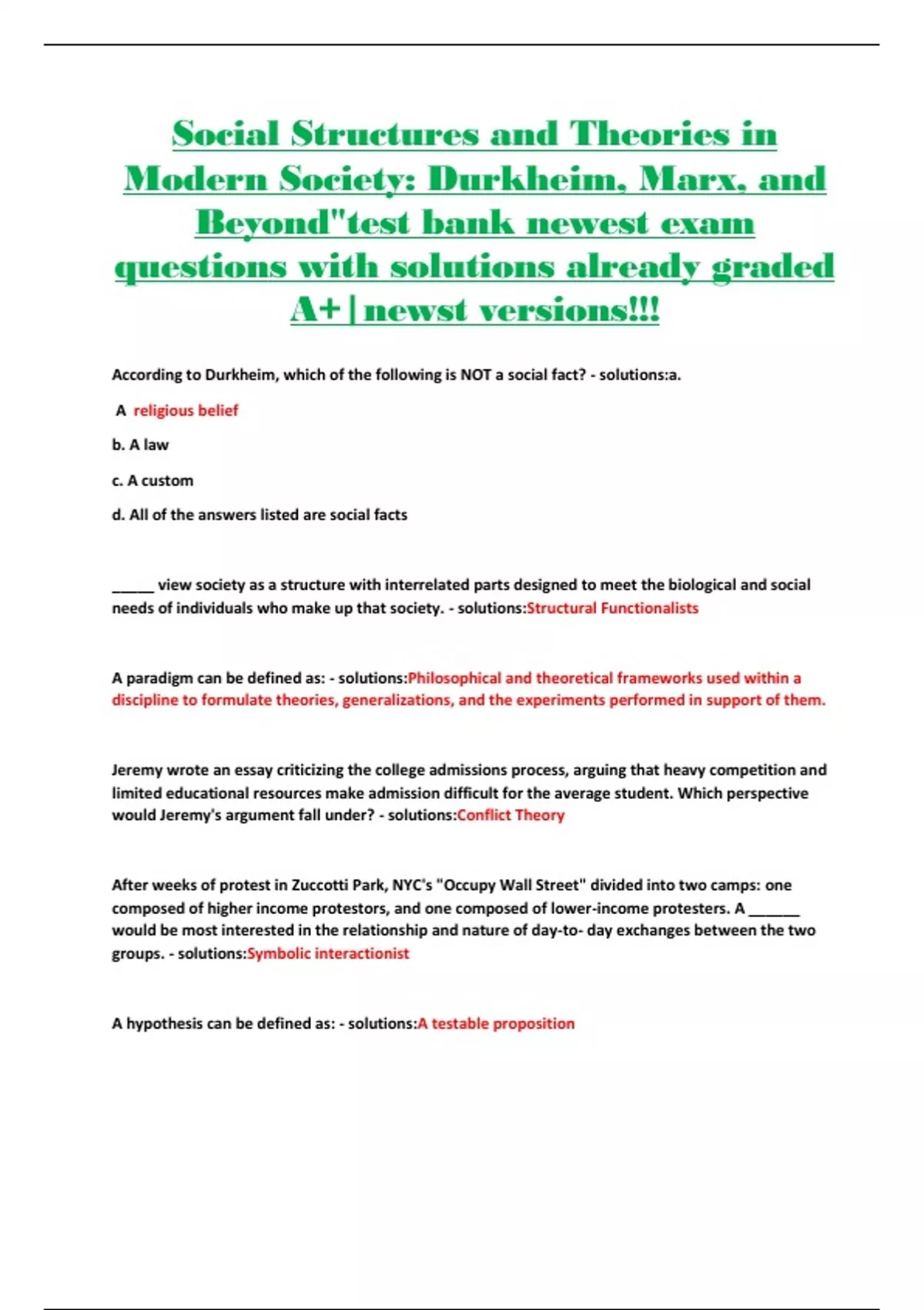 Social Structures and Theories in Modern Society: Durkheim, Marx, and Beyond"test bank newest exam questions with solutions already graded A+|newst versions!!!