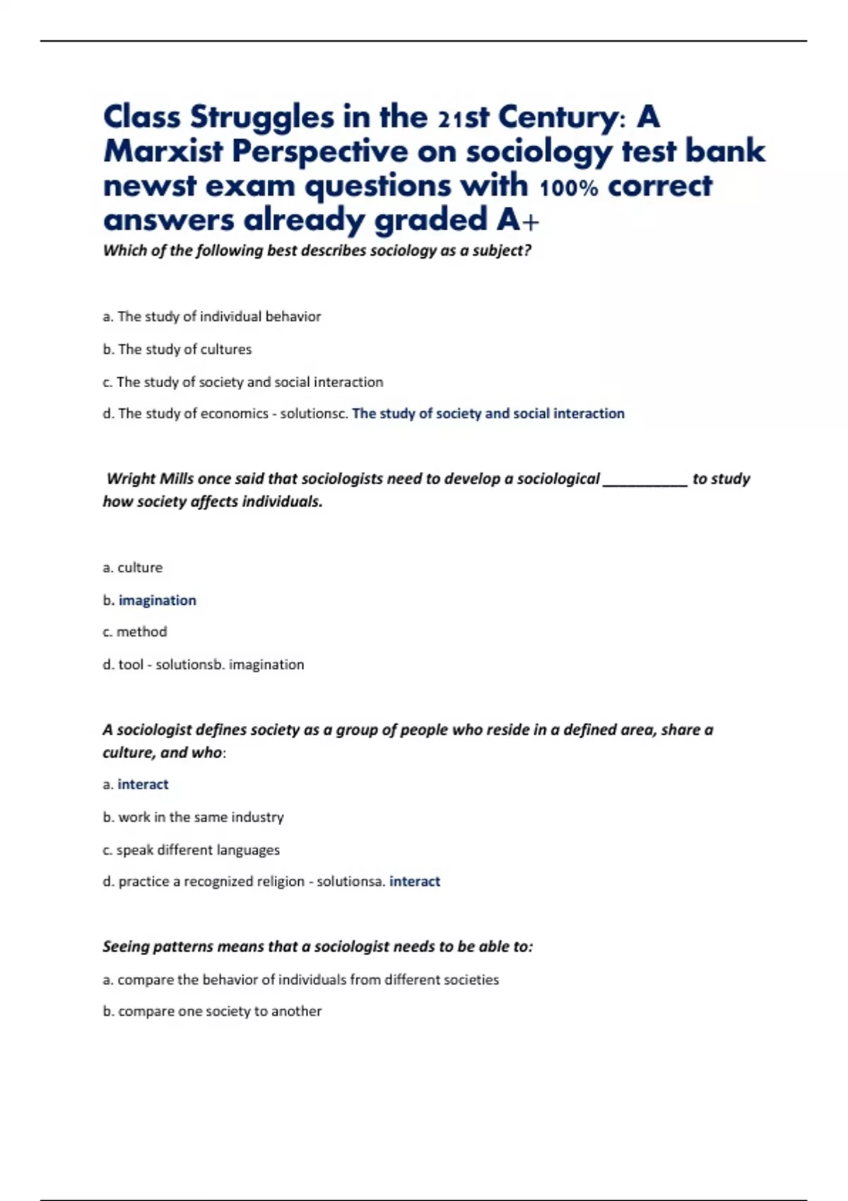 Class Struggles in the 21st Century: A Marxist Perspective on sociology test bank newst exam questions with 100% correct answers already graded A+
