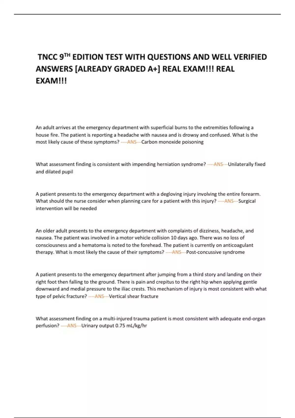 TNCC 9 TH EDITION TEST WITH QUESTIONS AND WELL VERIFIED ANSWERS [ALREADY GRADED A+] REAL EXAM!!! REAL EXAM!!! An adult arrives at the emergency department with superficial burns to the extremities following a house fire. The patient is reporting a headache with nausea and is drowsy and confused. What is the most likely cause of these symptoms? ----ANS---Carbon monoxide poisoning What assessment finding is consistent with impending herniation syndrome? ----ANS---Unilaterally fixed and dilated pupil A patient presents to the emergency department with a degloving injury involving the entire forearm. What should the nurse consider when planning care for a patient with this injury? ----ANS---Surgical intervention will be needed An older adult presents to the emergency department with complaints of dizziness, headache, and nausea. The patient was involved in a motor vehicle collision 10 days ago. There was no loss of consciousness and a hematoma is noted to the forehead. The patient is currently on anticoagulant therapy. What is most likely the cause of their symptoms? ----ANS---Post-concussive syndrome