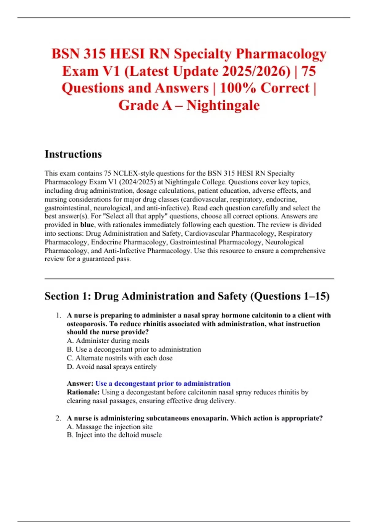 This exam contains 75 NCLEX-style questions for the BSN 315 HESI RN Specialty