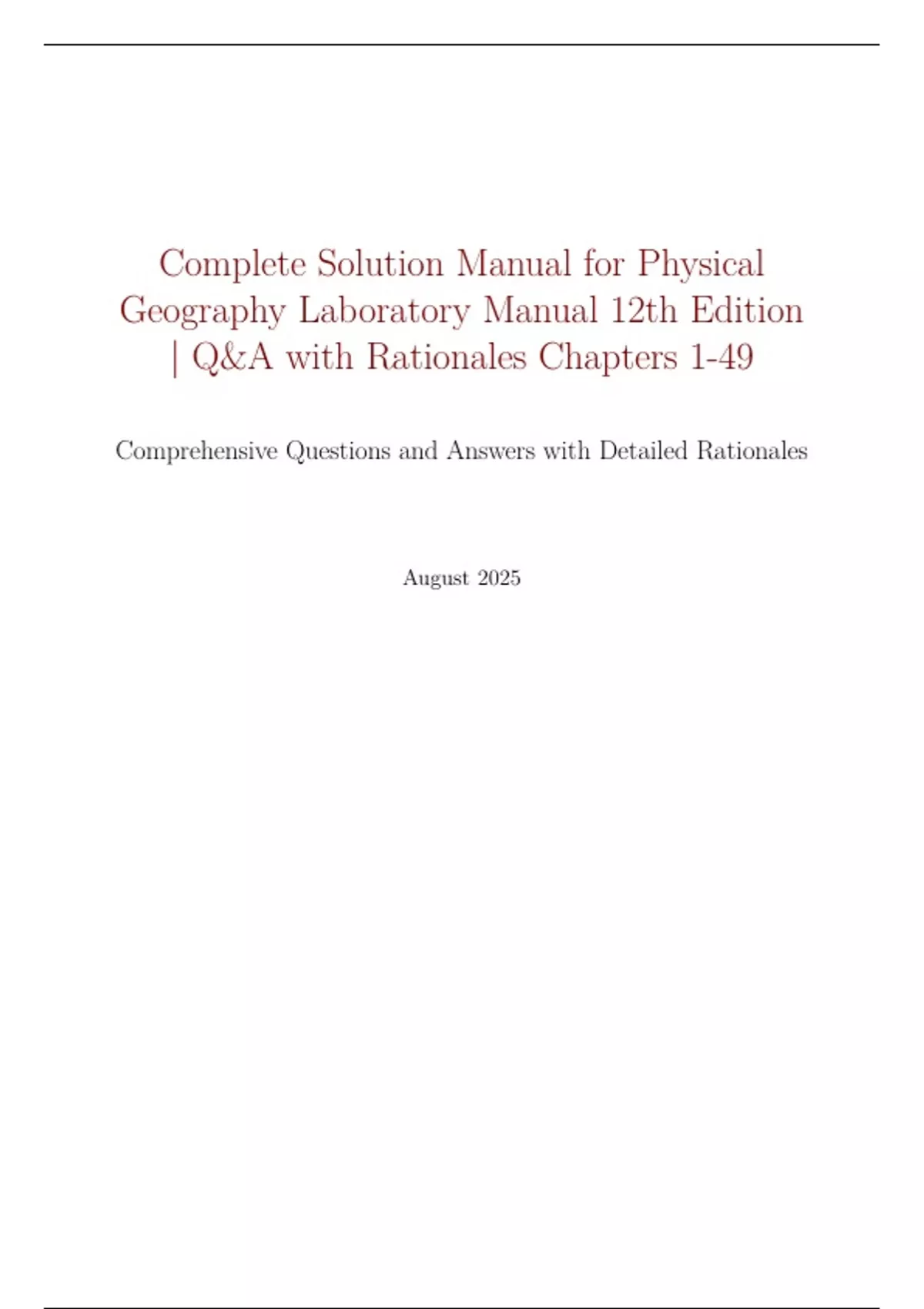 Complete Solution Manual for Physical Geography Laboratory Manual 12th Edition | Q&A with Rationales Chapters 1-49 Comprehensive Questions and Answers with Detailed Rationales August 2025 Introduction This solution manual provides detailed answers and rationales for exercises in the Physical Geography Laboratory Manual, 12th Edition by Darrel Hess, accompanying McKnight’s Physical Geography: A Landscape Appreciation, 12th Edition. It covers Chapters 1–49, including 100 new, relevant questions to deepen understanding of physical geography con cepts such as metric conversions, map skills, atmospheric processes, geomorphology, and climate systems. Each question is paired with a concise answer and a detailed rationale to clarify the reasoning, ensuring alignment with the manual’s learning objectives. The document is structured to produce a 60+ page PDF when compiled, focusing on clarity and educational value.